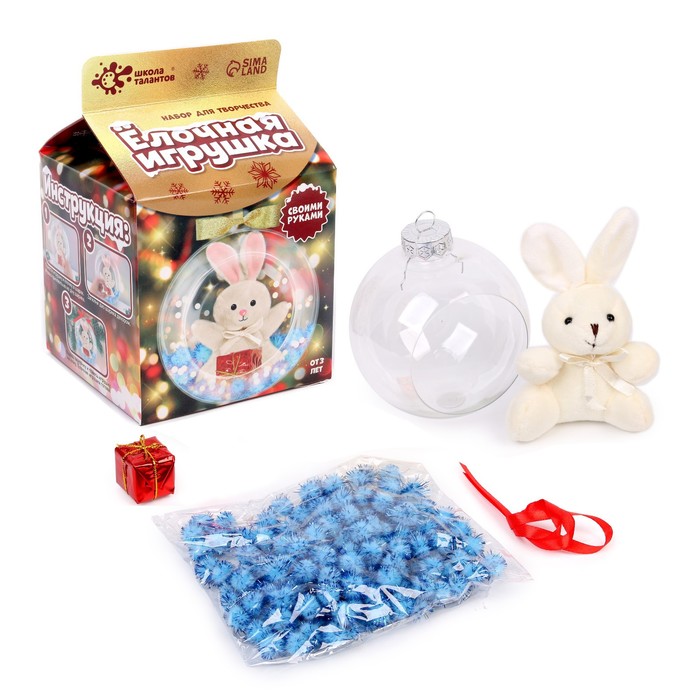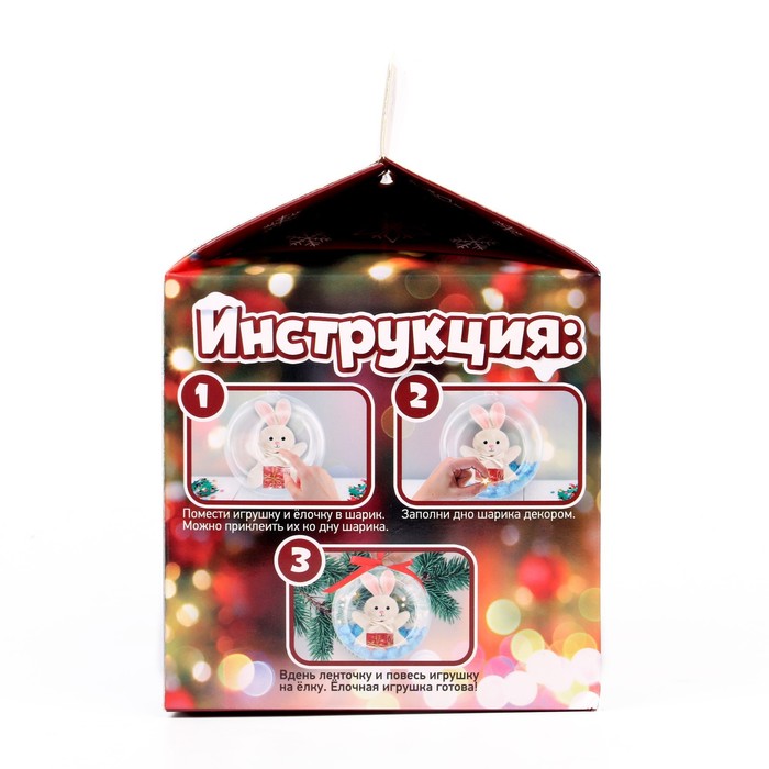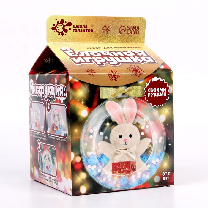 Производитель: Школа талантов; Габариты: 11,5 x 11,5 x 17,5; Страна: Китай; В боксе: 32 набор; Состав: Пластик, текстиль; Материалы: пластик, текстиль; Фасовка: по 1 набор; Индивидуальная упаковка: Цветная картонная коробка; Габариты товара: 10,5 см × 10,5 см × 10,5 см; Сертификат: Не подлежит сертификации; Возраст: От 3 лет; Символ года: Нет; Тематика праздника: Новый год; Материал: Пластик, Текстиль; Для создания: Набор для декорирования; Составляющие набора: Ёлочное украшение; Возраст: Для детей; Фиксированная цена: Да Набор для творчества «Ёлочная игрушка» поможет ребёнку создать яркую праздничную подвеску. Что в наборе: * пластиковая основа для подвески; * мягкая мини-игрушка в виде кролика; * миниатюрные помпончики; * декор в виде подарка; * лента. Как создать подвеску 1. Поместите внутрь шара мягкую игрушку. 2. Приклейте подарок в лапки кролику (клей в комплект не входит). 3. Положите на дно шарика много помпончиков. 4. Проденьте в отверстие ленту, и ваша подвеска готова! Рекомендовано для детей от 3 лет.