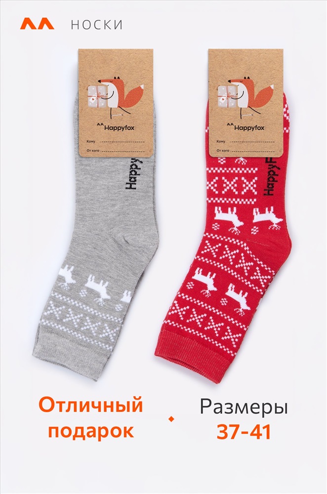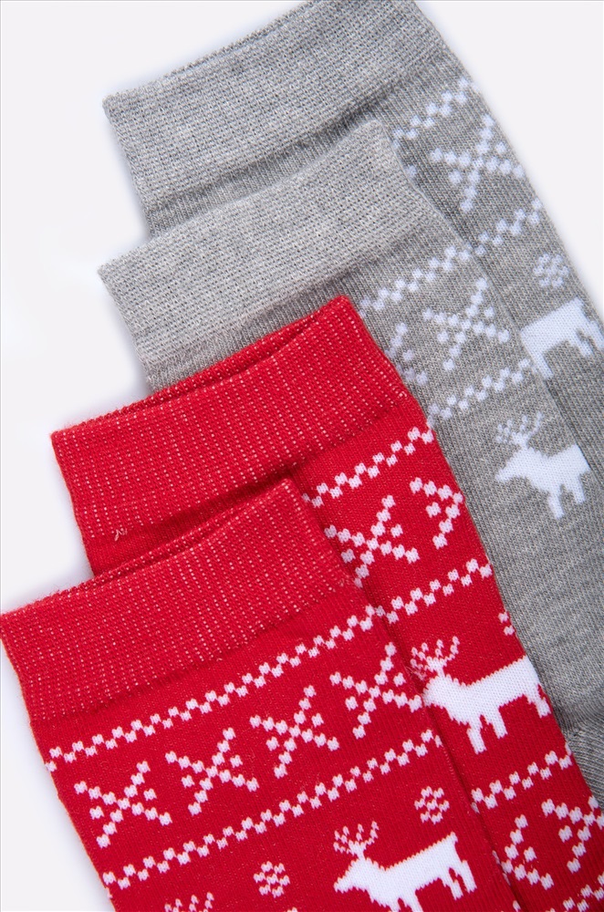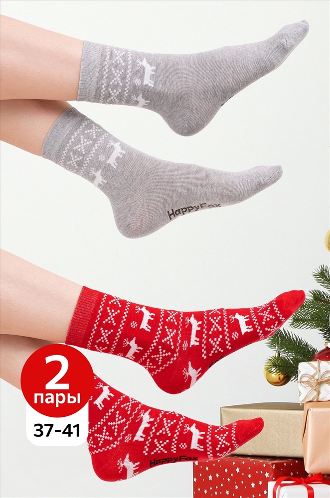 Набор женских носков с новогодним рисунком 2 пары из нежного хлопка – важный атрибут праздничного настроения. Новогодние носки выполнены в сером и красном цветах и украшены узором олени. Высокие носки идеальны в качестве подарка на Новый год и Рождество.
