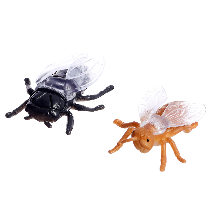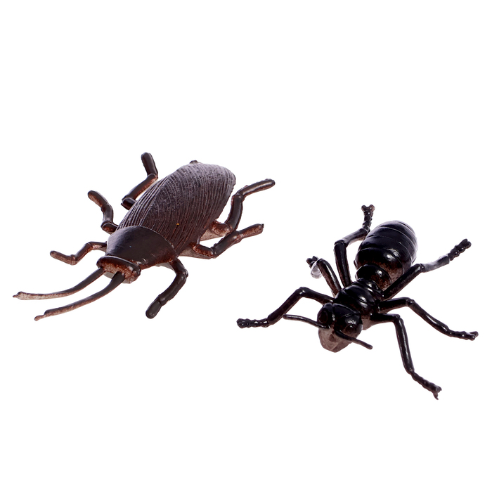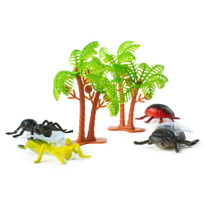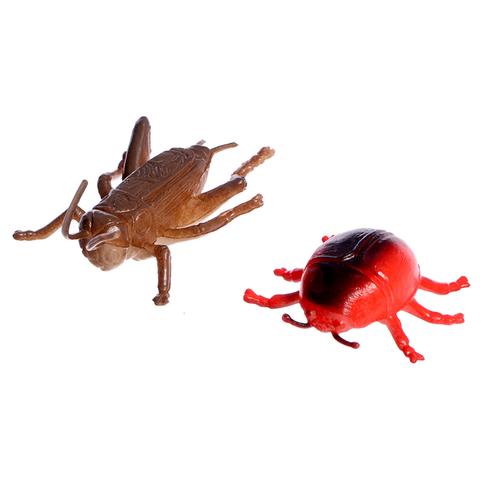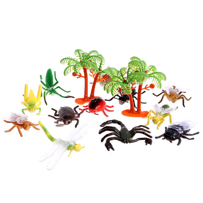 * В наборе 12 пластиковых фигурок: стрекоза, 3 вида кузнечиков, муравей, скорпион, богомол, божья коровка, жук, муха, оса, майский жук.