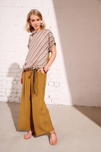 Блузка прямого силуэта, комбинированная из однотонного и принтованного полотна на основе вискозы. Овальный вырез горловины, цельнокроенные рукава сосборены на резинку. Спинка длинее переда, боковые швы заканчиваются разрезами, соединенными декоративной тесьмой. Передняя полочка сосборена на резинку, с кулиской из декоративной ленты-тесьмы. Комментарии к товару