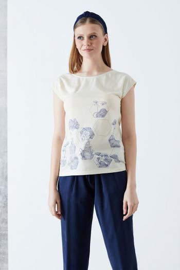 Модель суббренда бренда NELVA Футболка прямого силуэта. Спущенная линия плеча, овальный вырез горловины. Украшена цветочно-геометричным принтом со стразами. Комментарии к товару