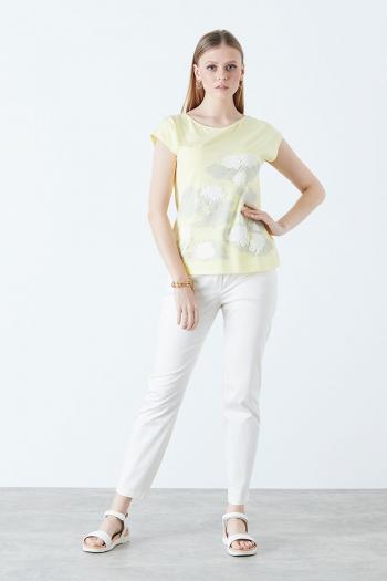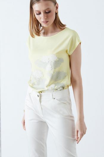 Модель суббренда бренда NELVA Футболка прямого силуэта. Спущенная линия плеча, овальный вырез горловины. Украшена цветочным принтом с аппликацией и стразами.