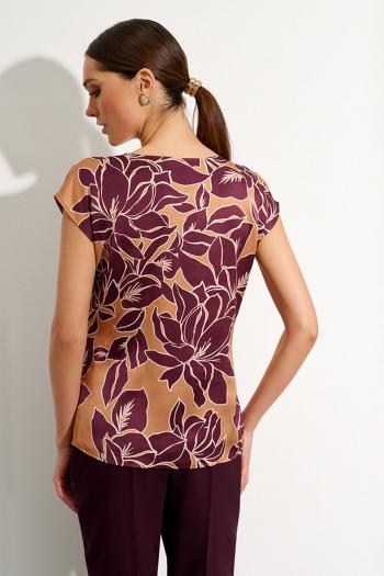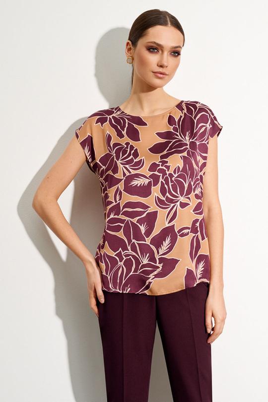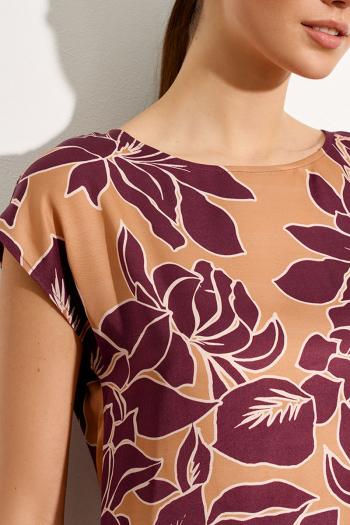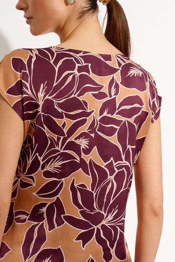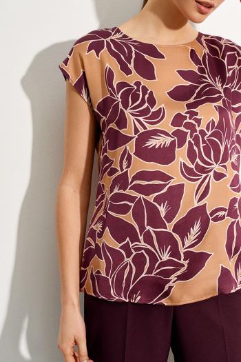 Топ-туника из принтованного полотна «Цветы бордо». Оовальный вырез горловины. Спущенная линия плеча с небольшими цельнокроеными рукавами. Комментарии к товару