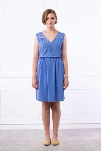 Модель суббренда бренда NELVA Легкое летнее платье, отрезное по линии талии. Глубокий V-образный вырез горловины, застегивается на 4 навесные петли и 4 пуговицы. Перед и спинка лифа с притачными кокетками и вставками из декоративной тесьмы. На поясе шлёвки. Нижняя часть платья на подкладке. Комментарии к товару