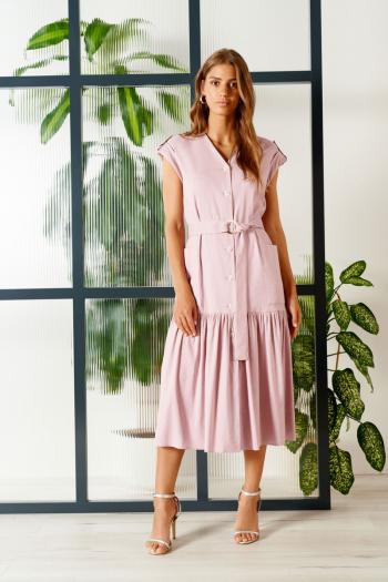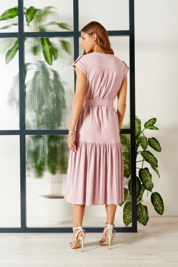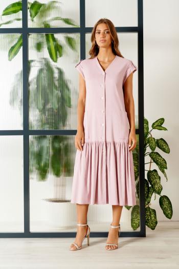 Платье прямого силуэта. V-образный вырез горловины, центральная застежка на пуговицы. Спущенная линия плеча с цельнокроеными рукавами-отворотами с патой и застежкой на пуговицу. По бокам объемные накладные карманы. Притачная оборка с заложенными в шов притачивания равномерными складками. Спинка с кокеткой, с заложенной в шов кокетки бантовой складкой. Дополняется поясом-лентой из основного полотна с декоративным кольцом. Комментарии к товару
