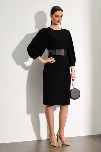 Платье-миди свободного силуэта. Округлый вырез горловины. Объемные рукава ¾, сосборены на резинку. Застежка на потайную молнию в среднем шве спинки. Дополняется двухсторонним поясом-лентой из контрастного полотна/ поясом-лентой из основного полотна. На подкладке.