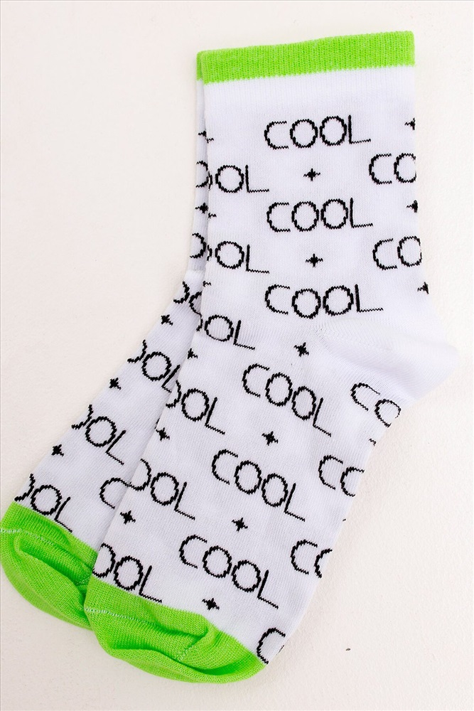 ID товара: 837390 Состав: 80% - Хлопок, 15% - Полиамид, 5% - Лайкра Сезон: Демисезон Рисунок: Надпись Основная ткань: Хлопок Вид носков/гольф: Фантазийные Страна бренда: Россия Страна производства: Россия ПРОДАЕТСЯ ПО 6 ШТУК. Носки детские, размеры 20-24. Белые носки с зеленой каймой и принтом-надписями. Двойной борт. Комментарии к товару
