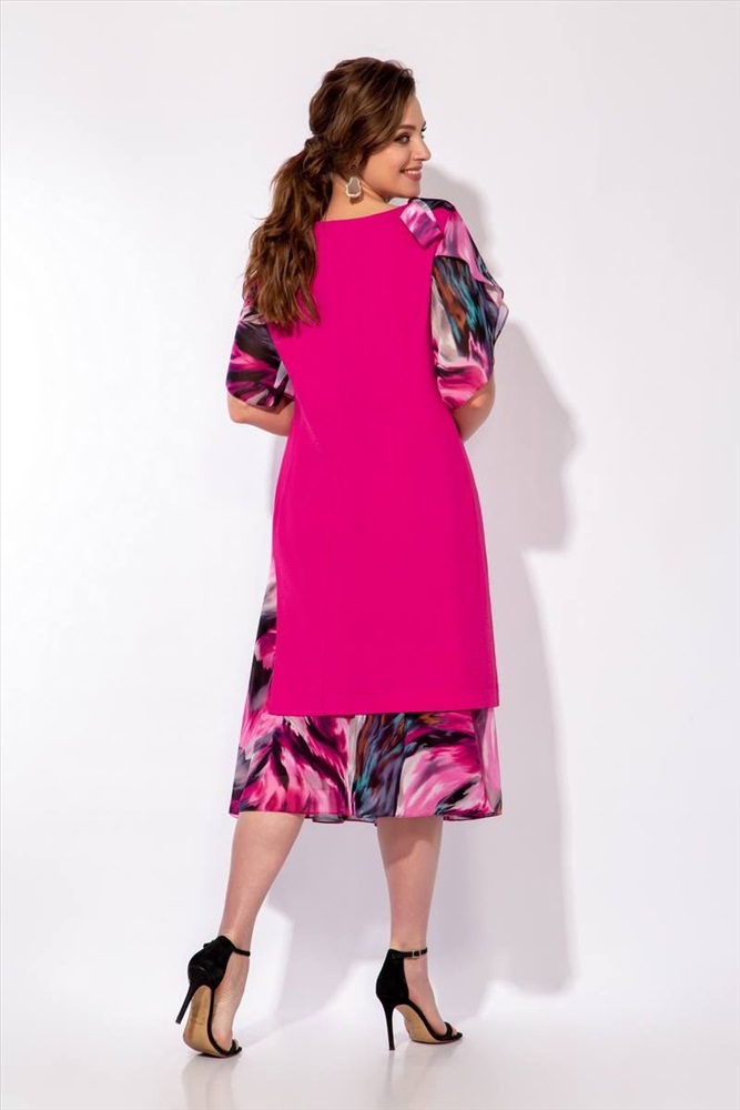 Комплект женский (туника и юбка). Туника полуприлегающего силуэта, с втачными рукавами, с асимметричным вырезом в левом боковом шве, на правом плече расположен декоративный бант. Деталь переда с нагрудными вытачками. Деталь спинки туники с талиевыми вытачками. Рукава втачные одношовные, короткие, расширенные, фантазийной формы.