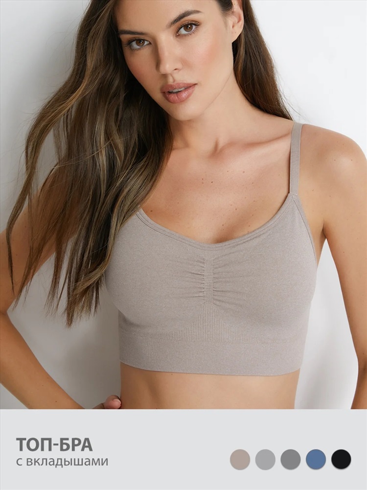 Бесшовный топ - бюстгальтер из меланжа, на эластичных регулируемых бретелях. Выполнен из мягкой микрофибры, которая приятно ощущается на теле, отлично пропускает воздух, впитывает влагу, хорошо сохраняет форму и цвет.