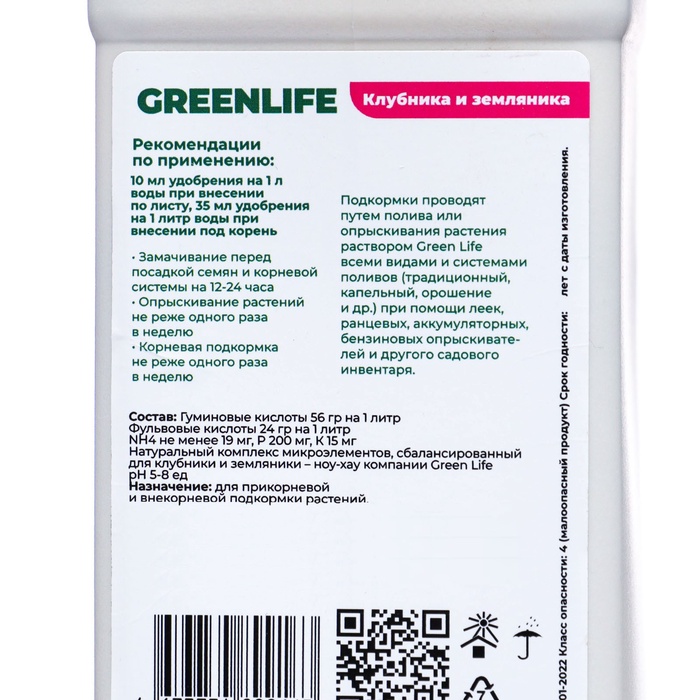 Производитель: Greenlife; Габариты: 6,5 x 6,5 x 18; Доставка: Платная; Страна: Россия; В боксе: 20 шт; Состав: См. на упаковке; Материалы: см. на упаковке; Фасовка: по 1 шт; Индивидуальная упаковка: Без упаковки; Сертификат: Не подлежит сертификации; Вид средства: Удобрение; Происхождение: Органические (природное); Препаративная форма: Жидкость; Вид: Удобрения; Состав (действующее вещество): Калий, Фосфор, Азот; Периоды применения: Круглогодичные; Комплексные удобрения: Да; Класс опасности: 4 класс (мало опасные); Группы элементов: Микроудобрения, Макроудобрения; Эффект: Антистресс; Вес/Объём: 1 л