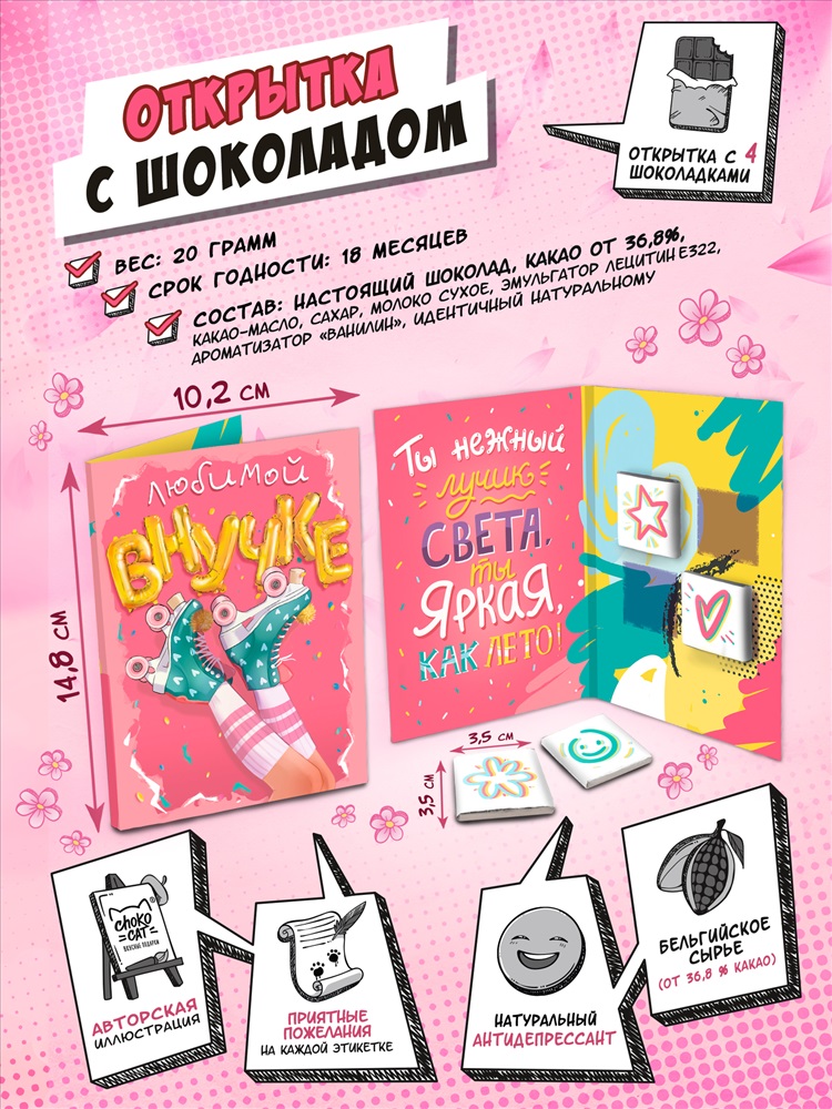 Любимой внучке, чтобы она всегда оставалась такой же озорной и счастливой! Яркие и современные открытки на любой повод, внутри которых 4 молочных шоколадки по 5 граммов. Каждая обёрнута в этикетку с оригинальной иллюстрацией.
