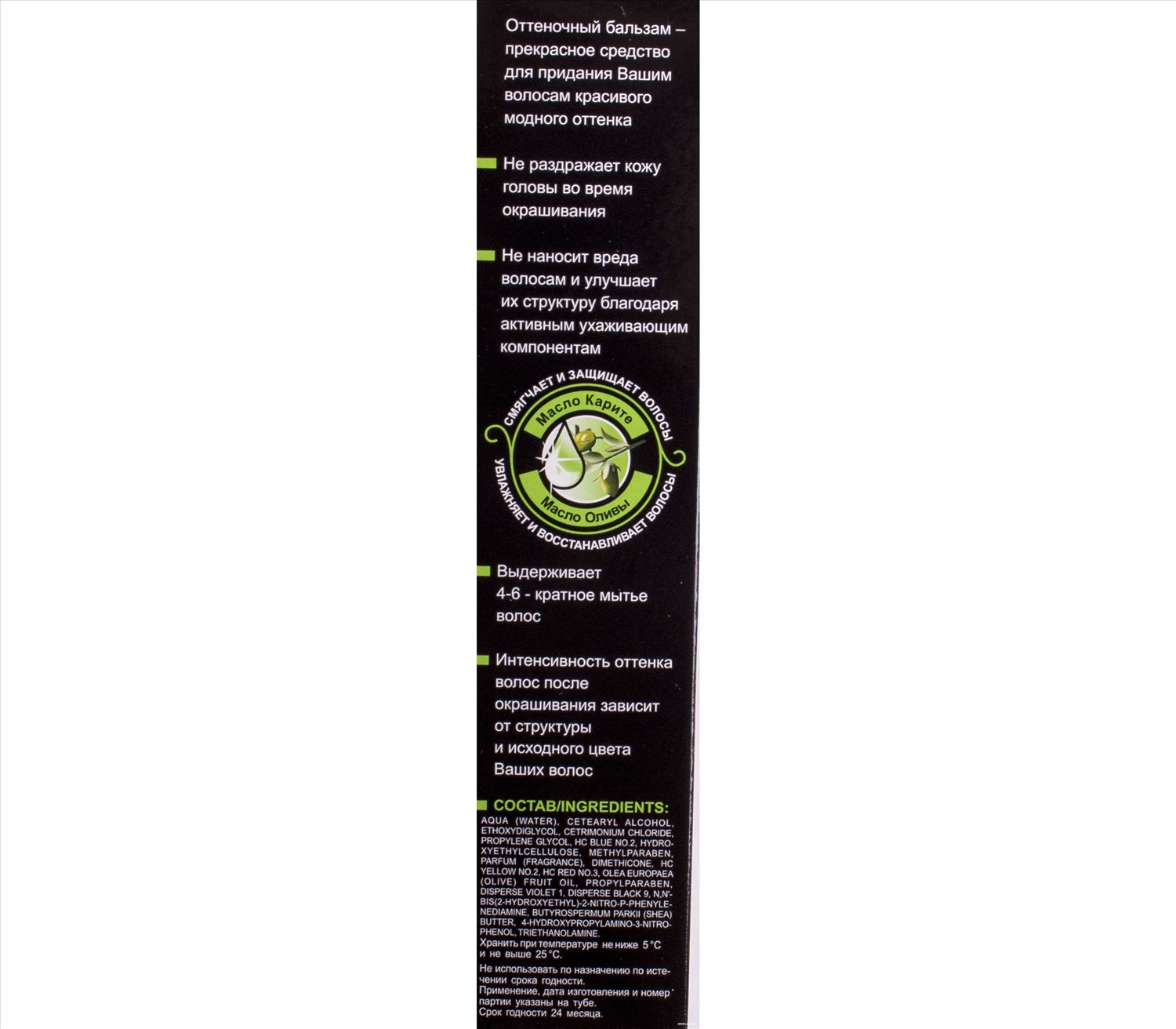 Оттеночный бальзам - прекрасное средство для придания Вашим волосам красивого модного оттенка. На раздражает кожу головы во время окрашивания. Не наносит вреда волосам и улучшает их структуру благодаря активным ухаживающим компонентам. Выдерживает 4-6 кратное мытье волос.