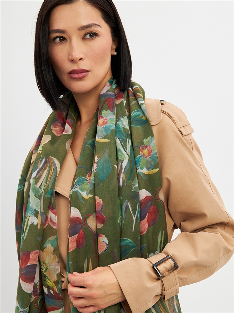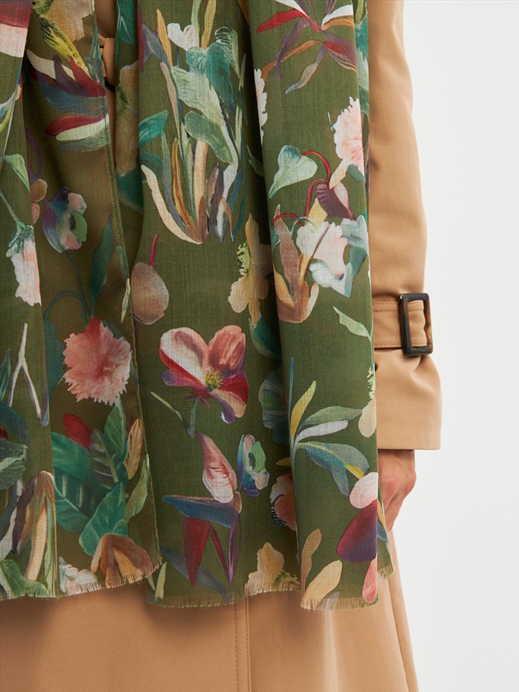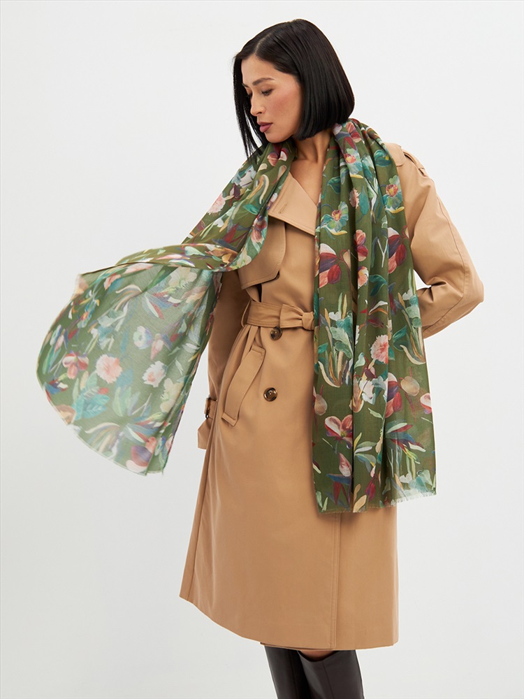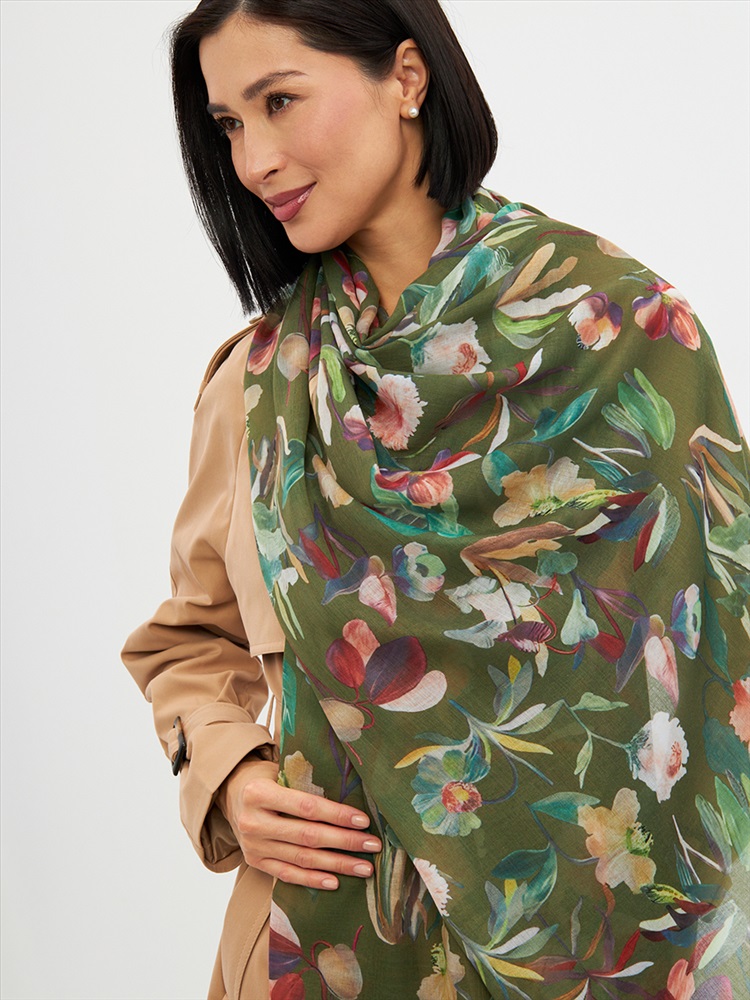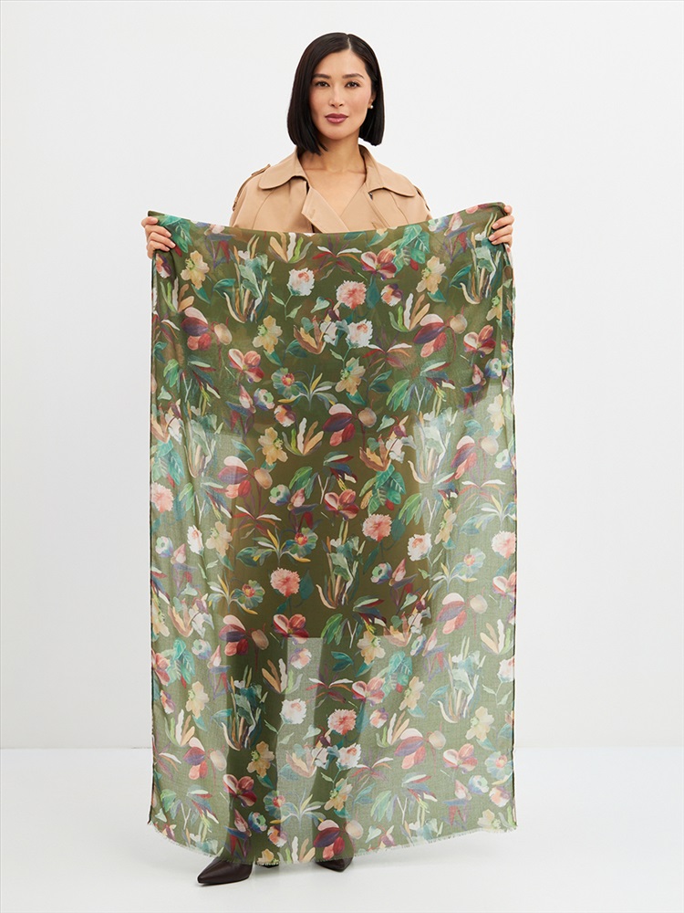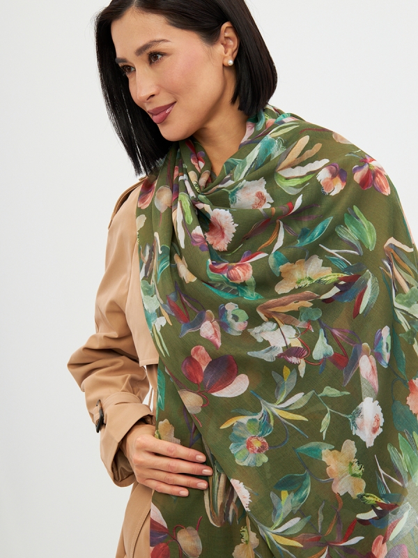Цвет: Зеленый, Коричневый Размер: 80 x 180 см Состав: 55% полиэстер, 35% вискоза, 10% шелк Состав: Вискоза, Полиэстер, Шелк Принт: Цветочный Большой, мягкий, тонкий и очень нежный палантин с рисунком. Края изделия украшены бахромой ручной работы. Машинная деликатная стирка. Комментарии к товару