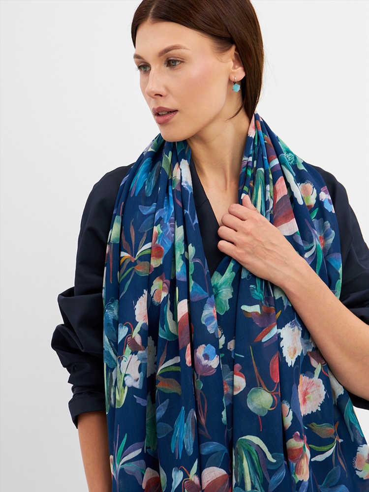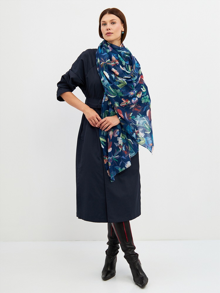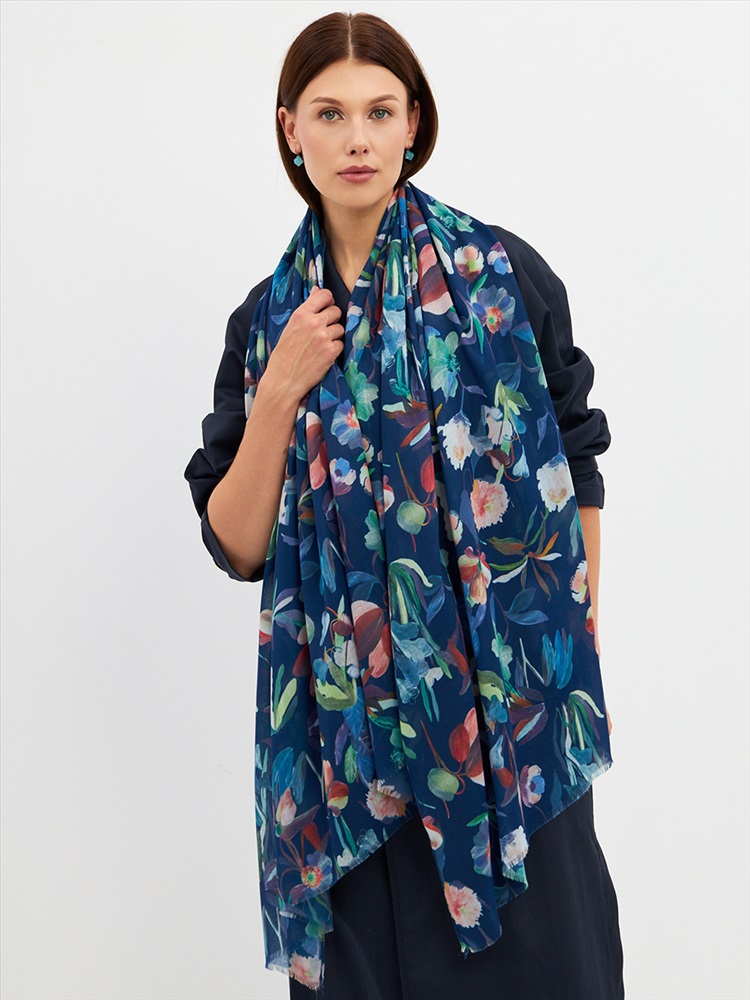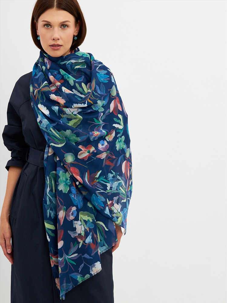 Цвет: Синий Размер: 80 x 180 см Состав: 55% полиэстер, 35% вискоза, 10% шелк Состав: Вискоза, Полиэстер, Шелк Принт: Абстракция Большой, мягкий, тонкий и очень нежный палантин с рисунком. Края изделия украшены бахромой ручной работы. Машинная деликатная стирка. Комментарии к товару