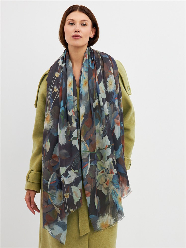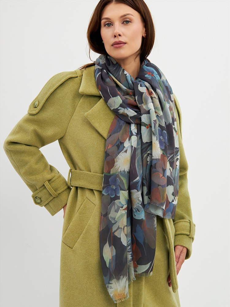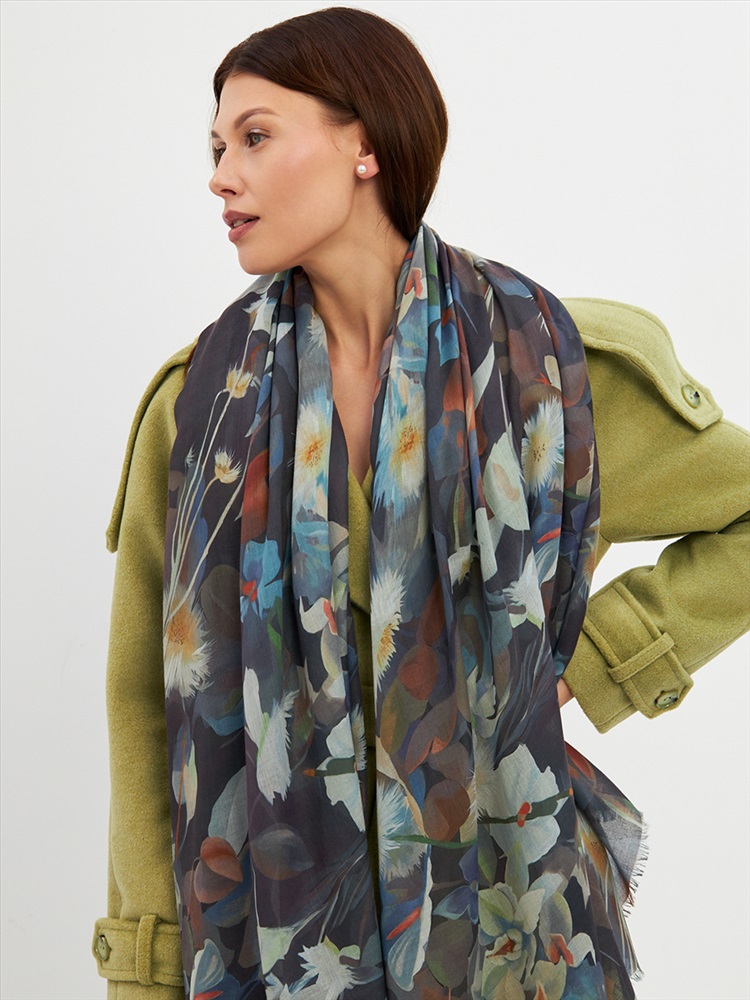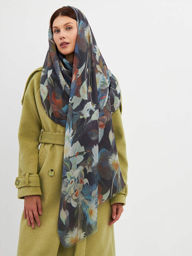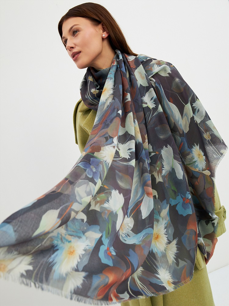 Цвет: Бежевый, Коричневый, Синий Размер: 80 x 180 см Состав: 55% полиэстер, 35% вискоза, 10% шелк Состав: Вискоза, Полиэстер, Шелк Принт: Цветочный Большой, мягкий, тонкий и очень нежный палантин с рисунком. Края изделия украшены бахромой ручной работы. Машинная деликатная стирка. Комментарии к товару