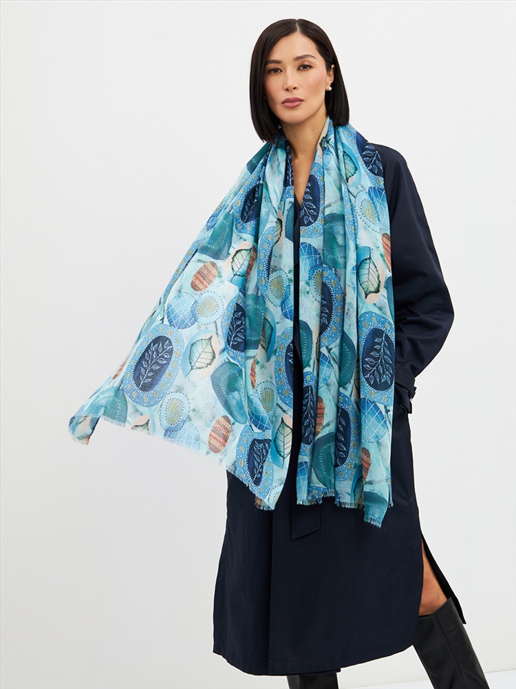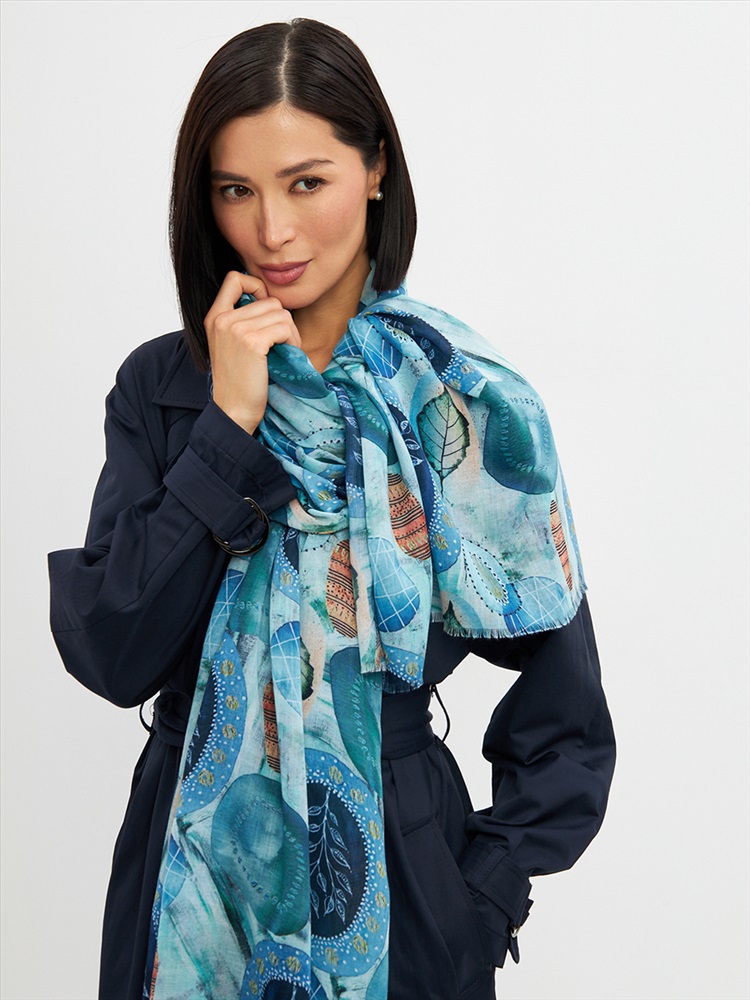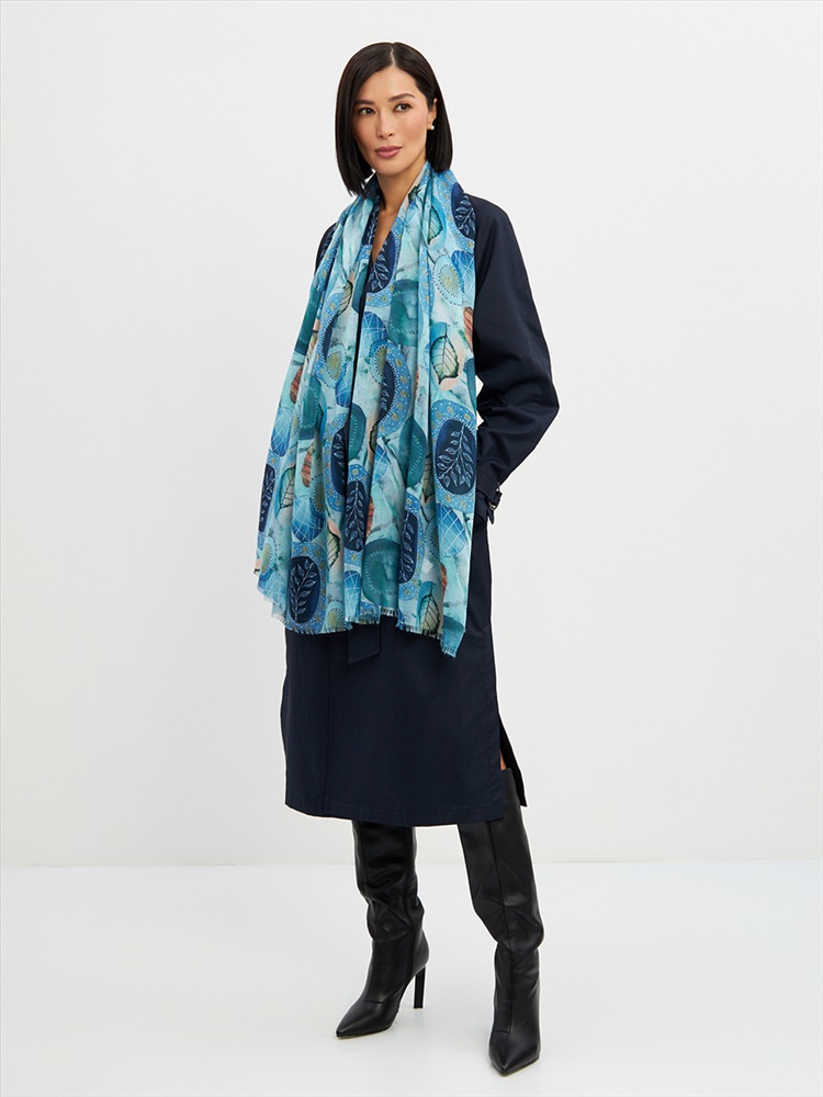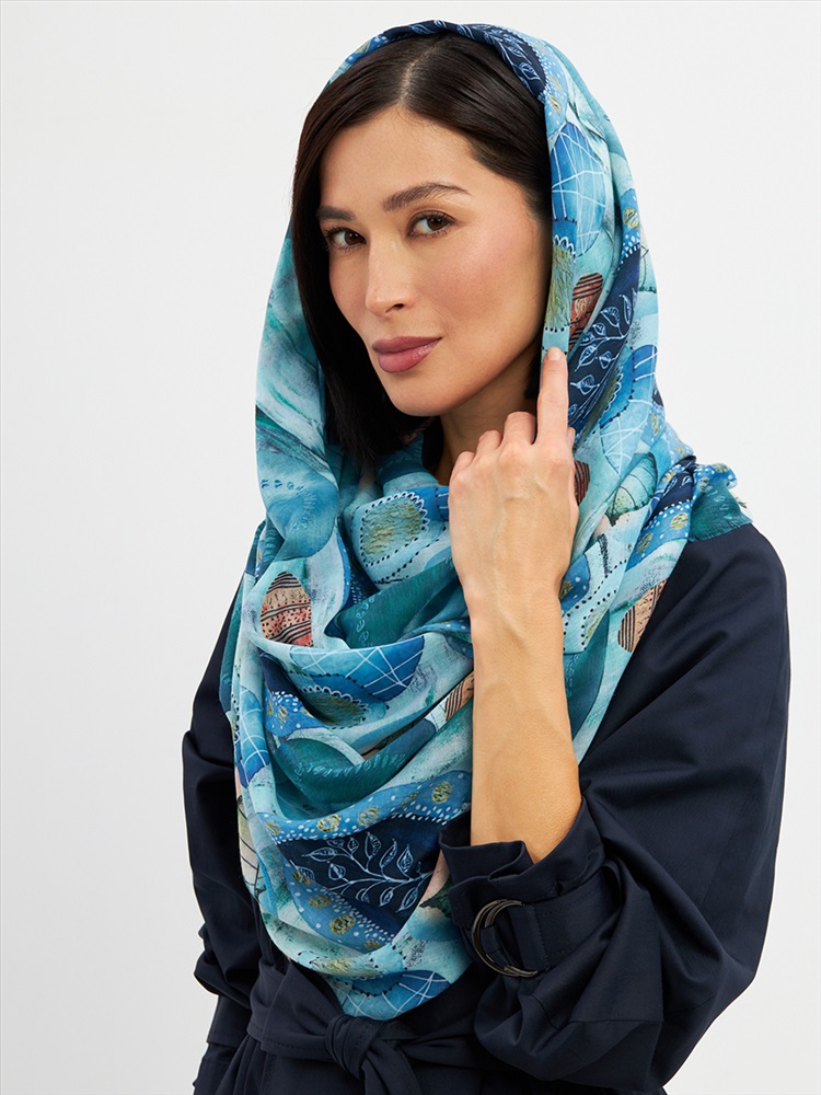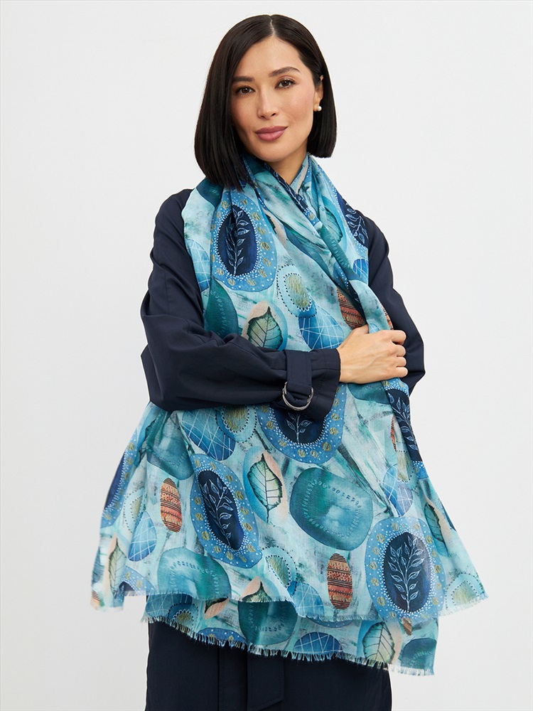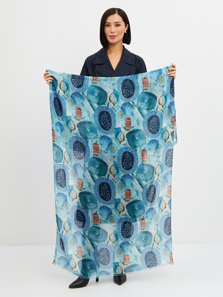 Цвет: Бирюзовый, Голубой, Зеленый, Синий Размер: 80 x 180 см Состав: 55% полиэстер, 35% вискоза, 10% шелк Состав: Вискоза, Полиэстер, Шелк Принт: Абстракция Большой, мягкий, тонкий и очень нежный палантин с рисунком. Края изделия украшены бахромой ручной работы. Машинная деликатная стирка. Комментарии к товару
