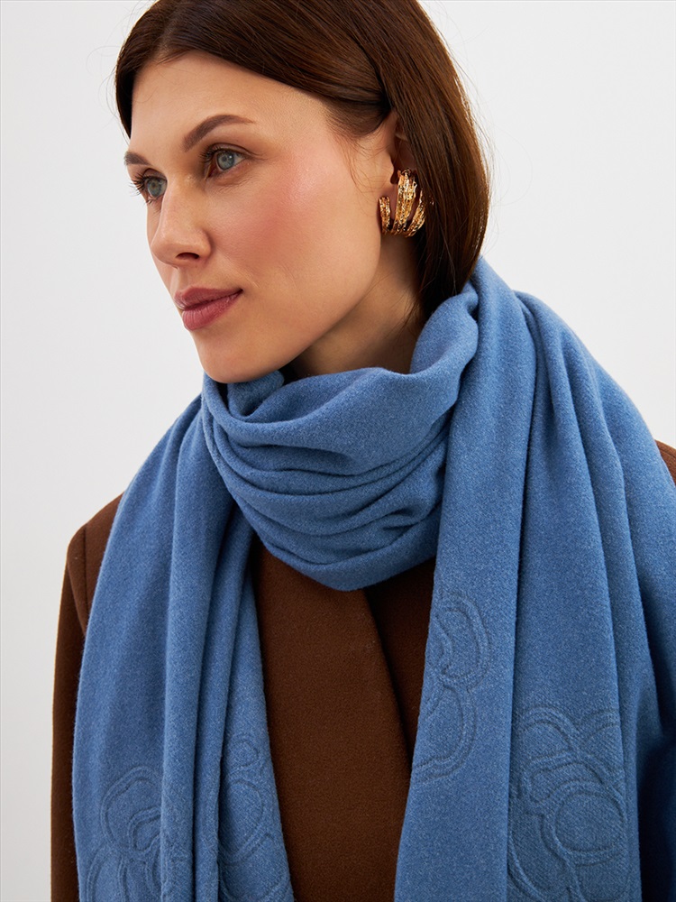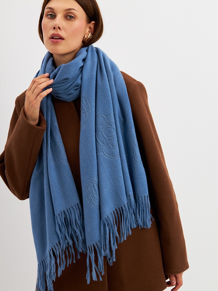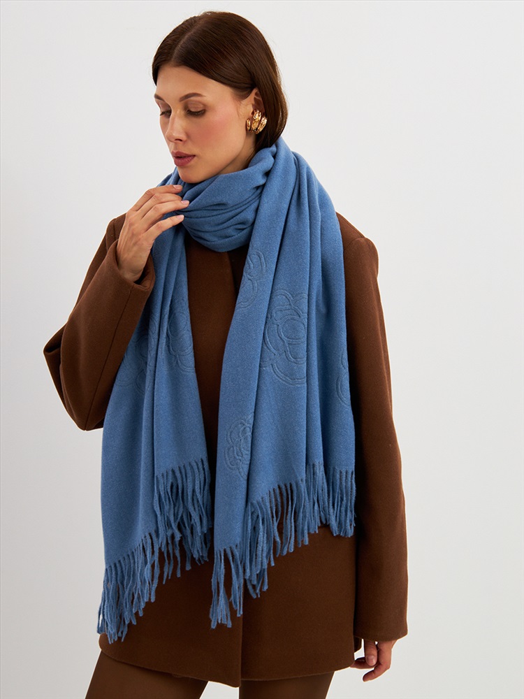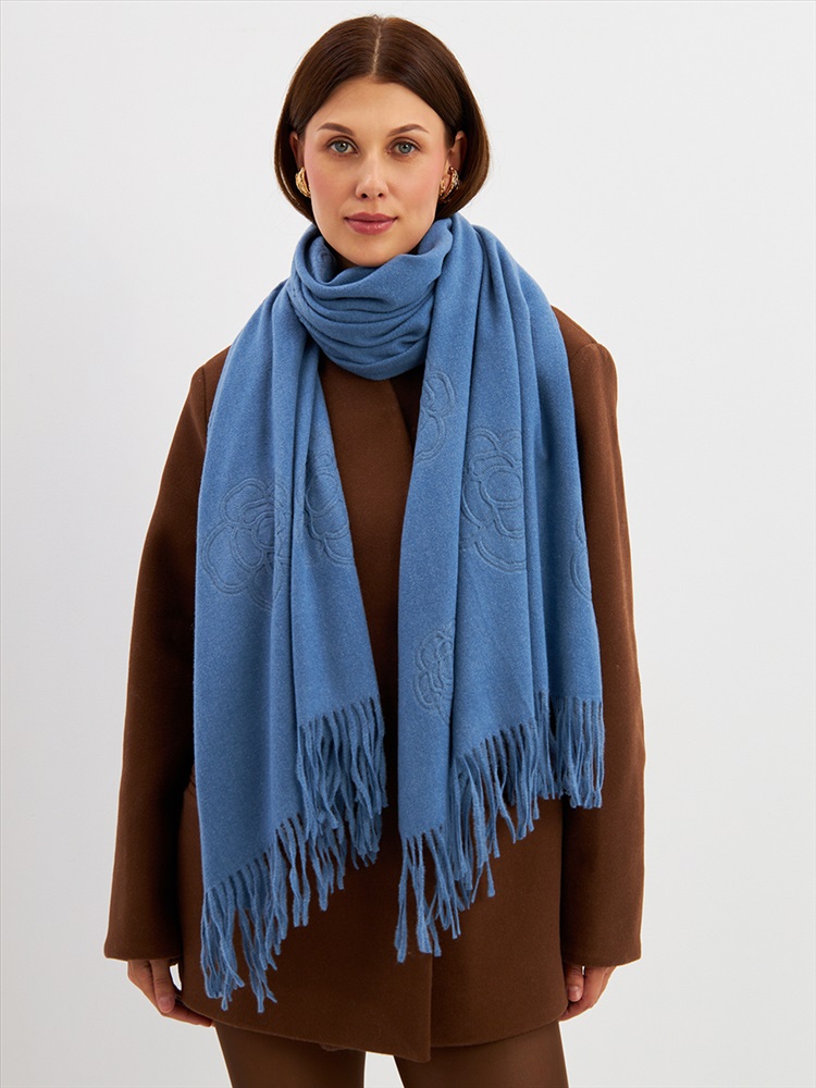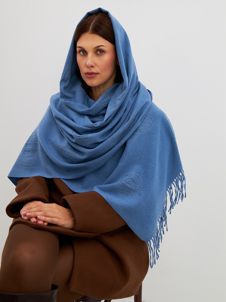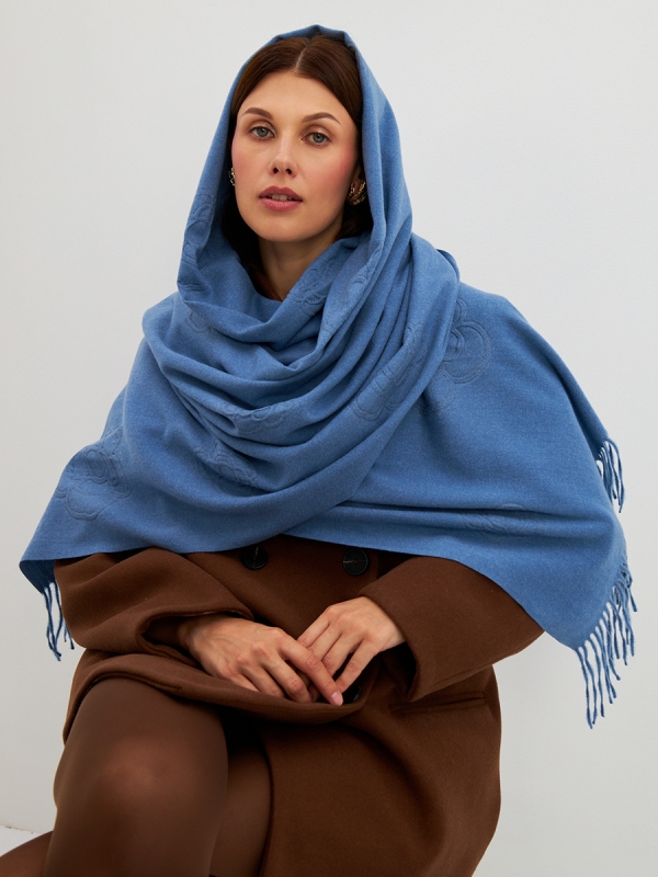 Большой, мягкий, теплый двусторонний однотонный палантин с принтом-печатью. Края изделия украшены бахромой. Машинная деликатная стирка.
