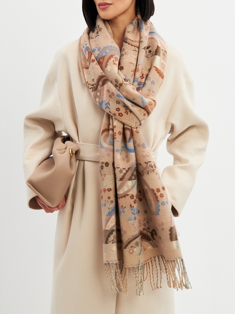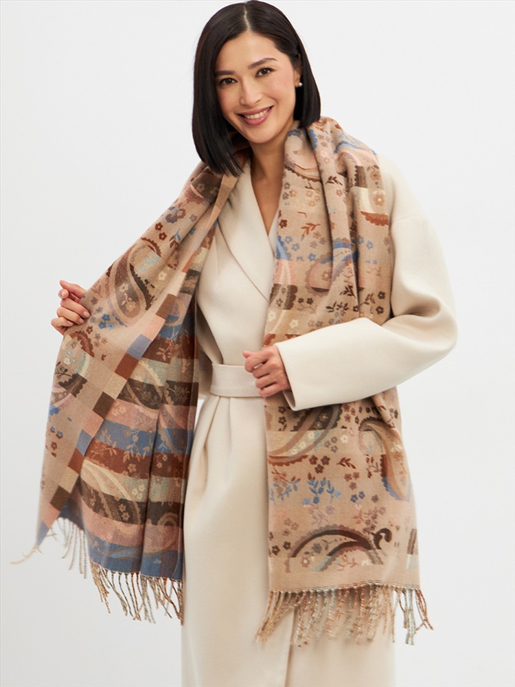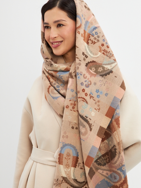 Цвет: Бежевый, Коричневый Состав: 55% вискоза, 25% кашемир, 20% шерсть Состав: Вискоза, Шерсть, Кашемир Размер: 70 x 180 см Принт: Абстракция Большой, мягкий, тонкий и очень нежный палантин с рисунком. Края изделия украшены бахромой ручной работы. Машинная деликатная стирка. Комментарии к товару