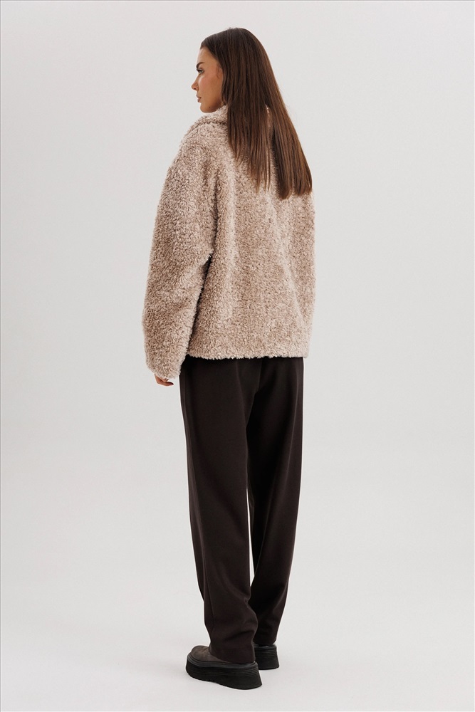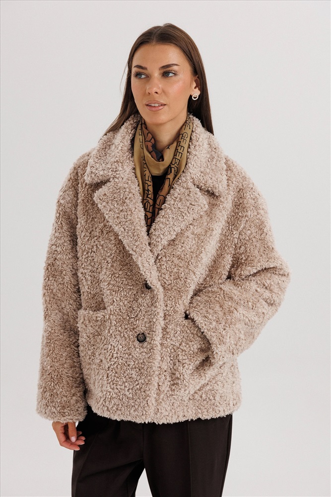 Женское укороченное пальто из искусственного меха — современное и уютное решение для холодного сезона. Мягкий фактурный мех дарит комфорт и тепло, а укороченный силуэт подчёркивает лёгкость и актуальность образа. Модель выполнена с однобортной застёжкой на пуговицы, широким отложным воротником и удобными накладными карманами. Универсальный бежевый оттенок легко сочетается с различными элементами гардероба: будь то классические брюки, джинсы или романтичные платья. Такое пальто станет стильным акцентом в повседневных и вечерних образах, позволяя выглядеть модно и чувствовать себя максимально комфортно. Пан 55%, ПЭ 38%, шерсть 7% Комментарии к товару