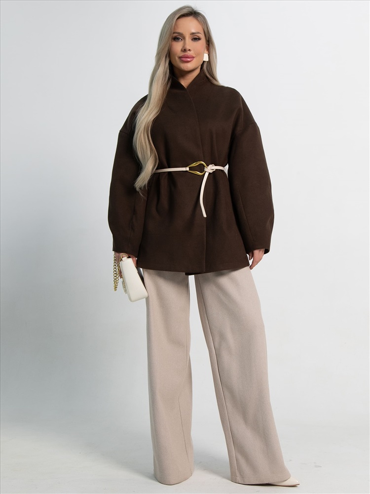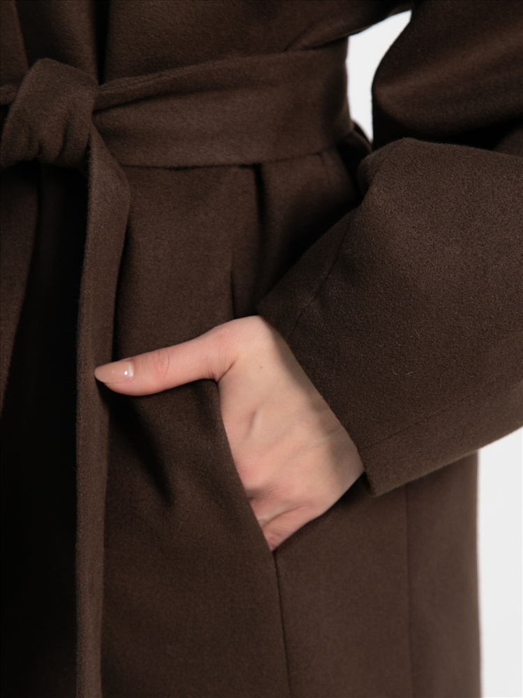 Элегантное женское пальто в изысканном оттенке горького шоколада — ваш незаменимый спутник в межсезонье. Эта модель станет жемчужиной вашего гардероба, гармонично сочетая модный дизайн и практичность. Оно прекрасно подходит как для создания утонченных деловых луков, так и для повседневного использования. В комплекте идет пояс из основной ткани, который позволяет регулировать силуэт, подчеркивая вашу талию и придавая образу женственность. Внутренняя подкладка обеспечивает максимальный комфорт и приятные тактильные ощущения при ношении. Пальто не только согреет вас в прохладные дни, но и добавит нотку элегантности к любому вашему выходу.