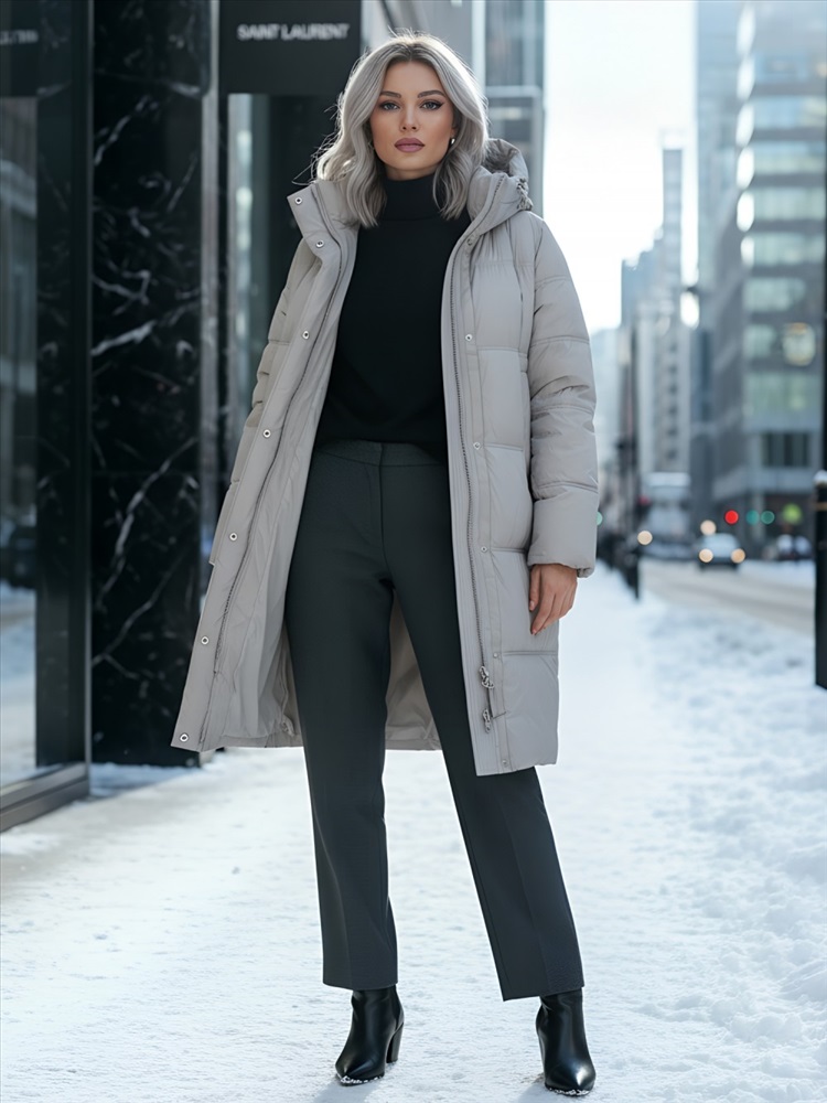 С водонепроницаемостью 7000 мм и плотностью утеплителя 240 г/кв.м, вы будете чувствовать себя комфортно даже при температуре от 0° до -20°. Утеплитель из тинсулейта обеспечивает тепло и легкость, позволяя вам наслаждаться зимними прогулками без лишних забот. Элегантный покрой с удлиненной длиной до колена и стильным капюшоном с фиксатором придают этому пальто утонченный вид, что делает его идеальным вариантом как для офиса, так и для повседневной жизни. Внутренние карманы добавляют практичности, а двойная молния и кнопки с клапаном подчеркивают современный стиль. Выбирайте из великолепных цветов: темно-серый, черный, темно-коричневый и серый, чтобы выразить свою индивидуальность. Шероховатая стеганая фактура материала не только привлекает внимание, но и обладает гипоаллергенными и дышащими свойствами. Не упустите возможность приобрести это прекрасное пальто из коллекции осень-зима 2025 и ощутите на себе идеальное сочетание стиля, комфорта и защиты от непогоды. С этим пальто вы будете выглядеть великолепно и чувствовать себя уверенно в любое время года! Комментарии к товару
