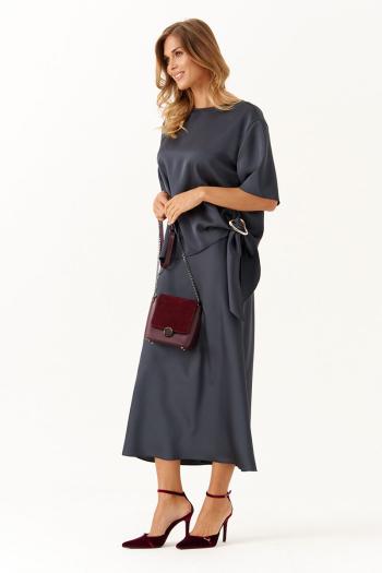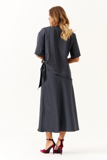 Этот графитовый костюм сочетает в себе изящество атласа и удобство, прекрасно подходя как для повседневных образов, так и для более официальных мероприятий.