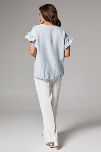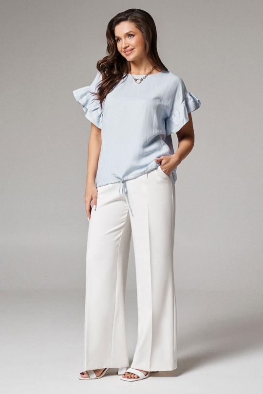 Блуза женская из льняной ткани для повседневной носки. Горловина круглая, пройма оформлена сборкой. На передней части изделия вышивка. По низу изделия кулиса.