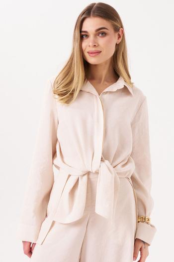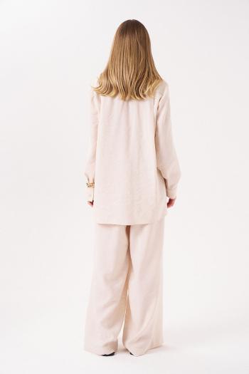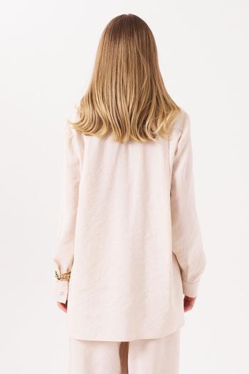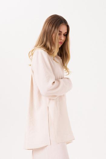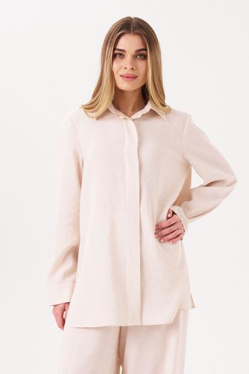 Блузка женская из смесовой ткани для повседневной носки. Блузка прямого силуэта. Застежка в блузке центральная бортовая на обметанные петли и пуговицы. Спинка с кокеткой и двумя складками. В боковых швах имеются разрезы. Горловина обработана рубашечным воротником с отрезной стойкой. Рукава втачные длинные, низ рукава обработан притачной манжетой с застежкой на одну обметанную петлю и одну пуговицу. Стильная блузка в элегантном бежевом цвете, которая обязательно осчастливит вас своим фасоном и чудесной посадкой.