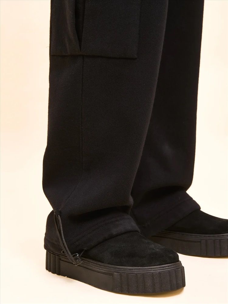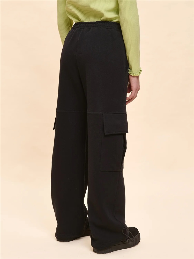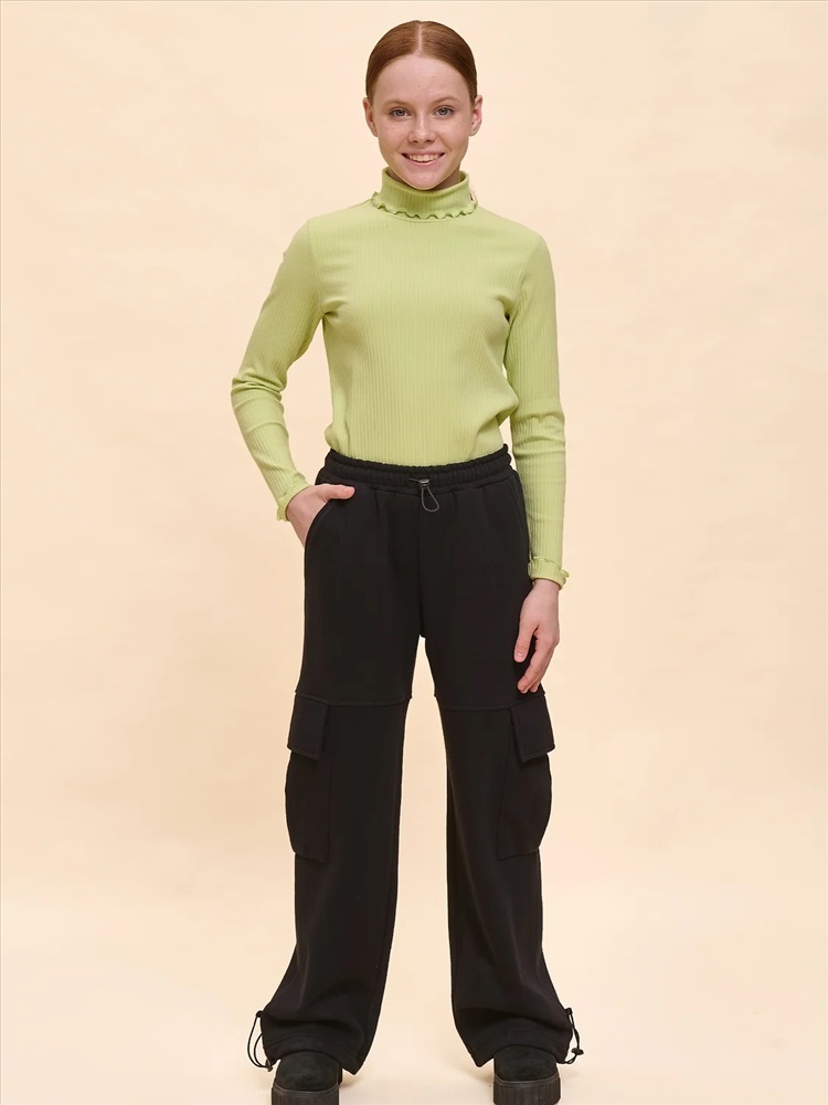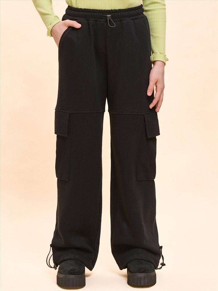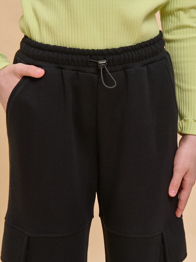Унисекс. Брюки-карго из смесового футерованного полотна с начесом. Брюки свободного кроя с боковыми и накладными карманами. Для придания объема на накладном кармане выполнена бантовая складка, вход в карман закрыт клапаном. На уровне расположения карманов выполнены подрезы, в которые входит верхний край клапана. Пояс из основного материала с прострочкой и регулировкой ширины с помощью эластик корд и стоппера. По низу брюк предусмотрена регулировка ширины с помощью эластик корд и стоппера.