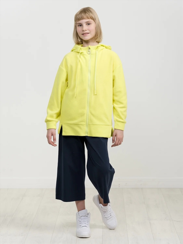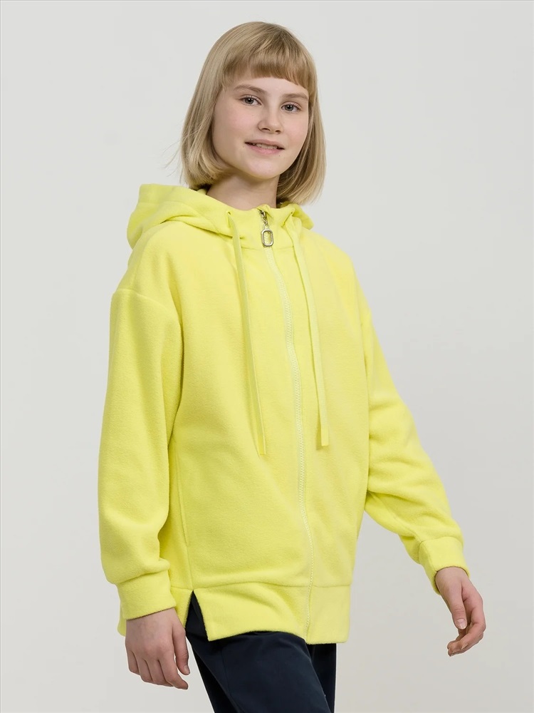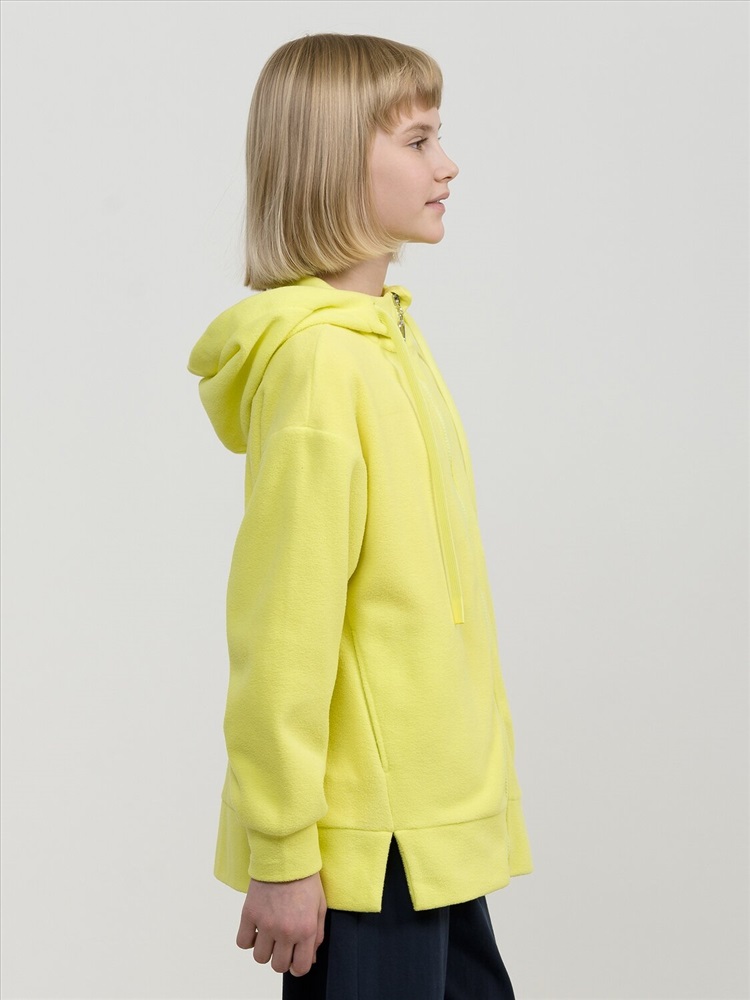 Флисовая крутка увеличенный объем, удлинённая, слегка трапециевидного силуэта, широкий рукав. Боковые швы смещены на полочку, заканчиваются разрезами. Карманы в боковых швах. Объем капюшона регулируется широким шнурком, концы которого обработаны по новому. По низу изделия и рукавов манжеты из основной ткани.