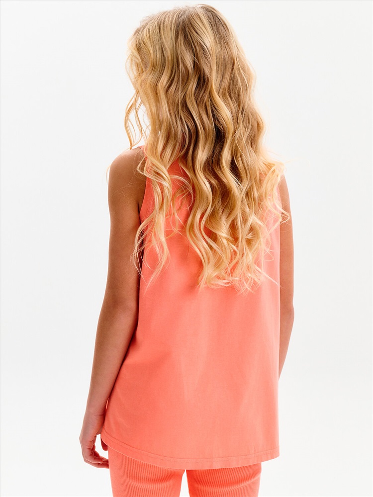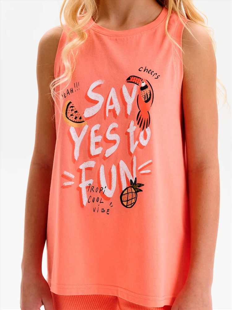 Майка для девочки. Выполнена из мягкого трикотажного полотна. Свободный трапециевидный силуэт с лёгким перепадом по низу делает модель удобной и не сковывает движения. Горловина и проймы аккуратно обработаны эластичной рибаной в тон ткани. Перевод: СКАЖИ ДА ВЕСЕЛЬЮ: ДА!!! УРА: ТРОПИКУЛ(ИГРА СЛОВ) ВАЙБ.