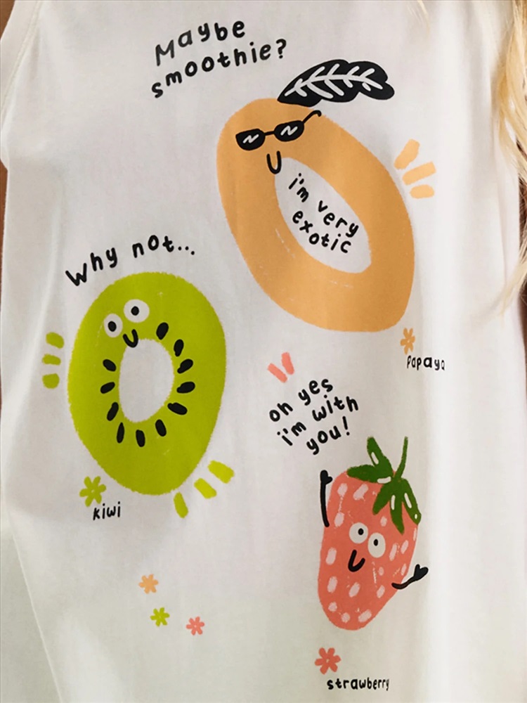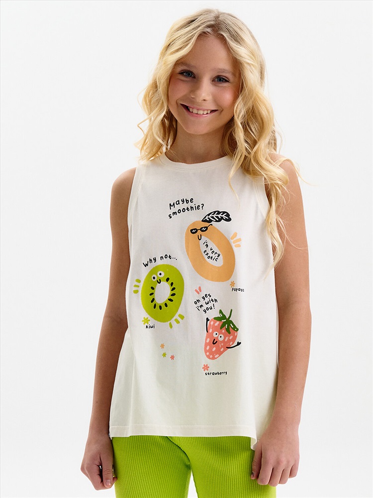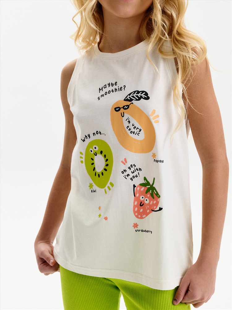 Майка для девочки. Выполнена из мягкого трикотажного полотна. Свободный трапециевидный силуэт с лёгким перепадом по низу делает модель удобной и не сковывает движения. Горловина и проймы аккуратно обработаны эластичной рибаной в тон ткани. Перевод: МОЖЕТ БЫТЬ СМУЗИ? ПОЧЕМУ НЕТ... О, ДА Я С ВАМИ! Я ОЧЕНЬ ЭКЗОТИЧНА. ПАПАЙЯ, КИВИ, КЛУБНИЧКА.