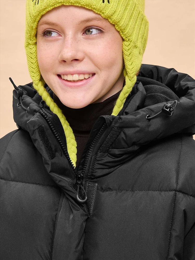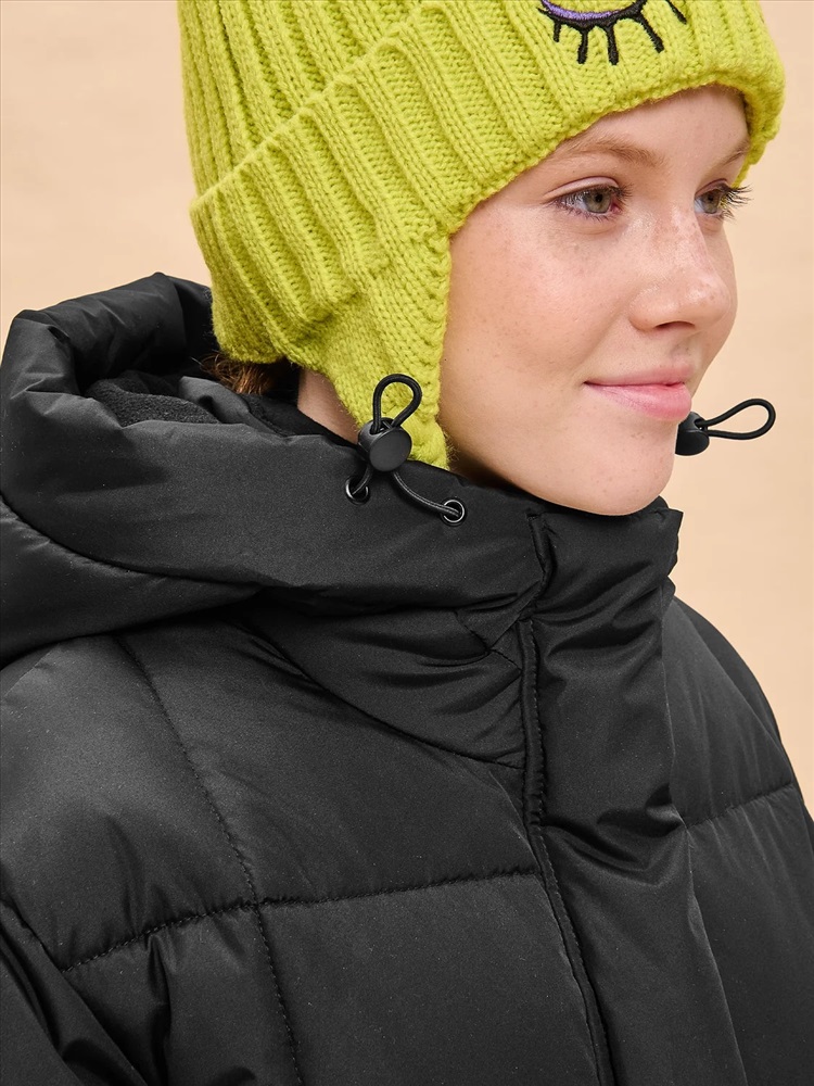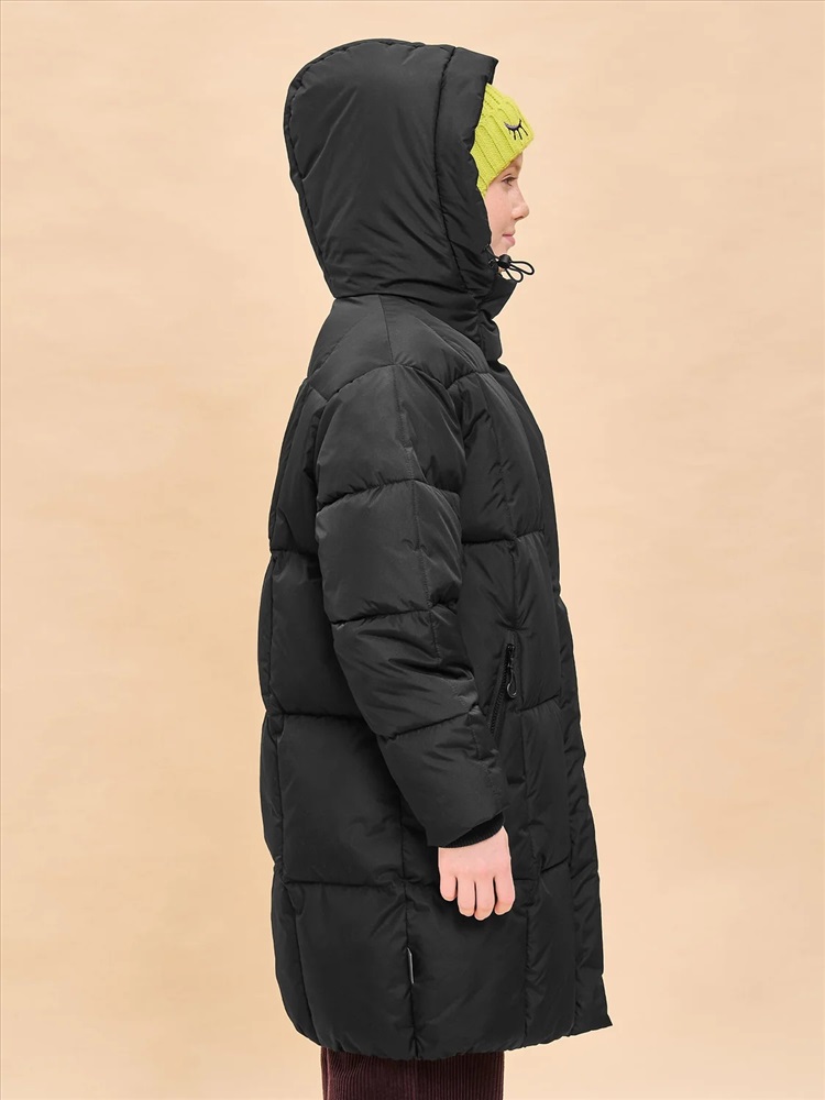 Over size. Зимнее пальто. Низ изделия собран на внутреннюю резину, что помогает сформировать овальный силуэт. Центральная планка на "застежке-велькро". Наполнителем является синтетический пух, который обеспечивает хорошие теплозащитные свойства в зимние морозы. Дополнительно, для защиты от ветра и холода, центральная молния с изнаночной стороны защищена ветрозащитной планкой. Ткань верха имеет водоотталкивающую пропитку. В рукавах есть внутренние манжеты из риба, которые препятствуют задуванию ветра. Прорезные карманы на молнии. В капюшоне используется регулировка эластичным шнуром со стопперами.Многозональный подклад: в верхней зоне флисовый, для дополнительного утепления плечевой области, внизу гладкий полиэстер для удобства надевания и удобства в носке. Центральная застежка-молния разъёмная сверху и снизу. Модель имеет светоотражающие элементы