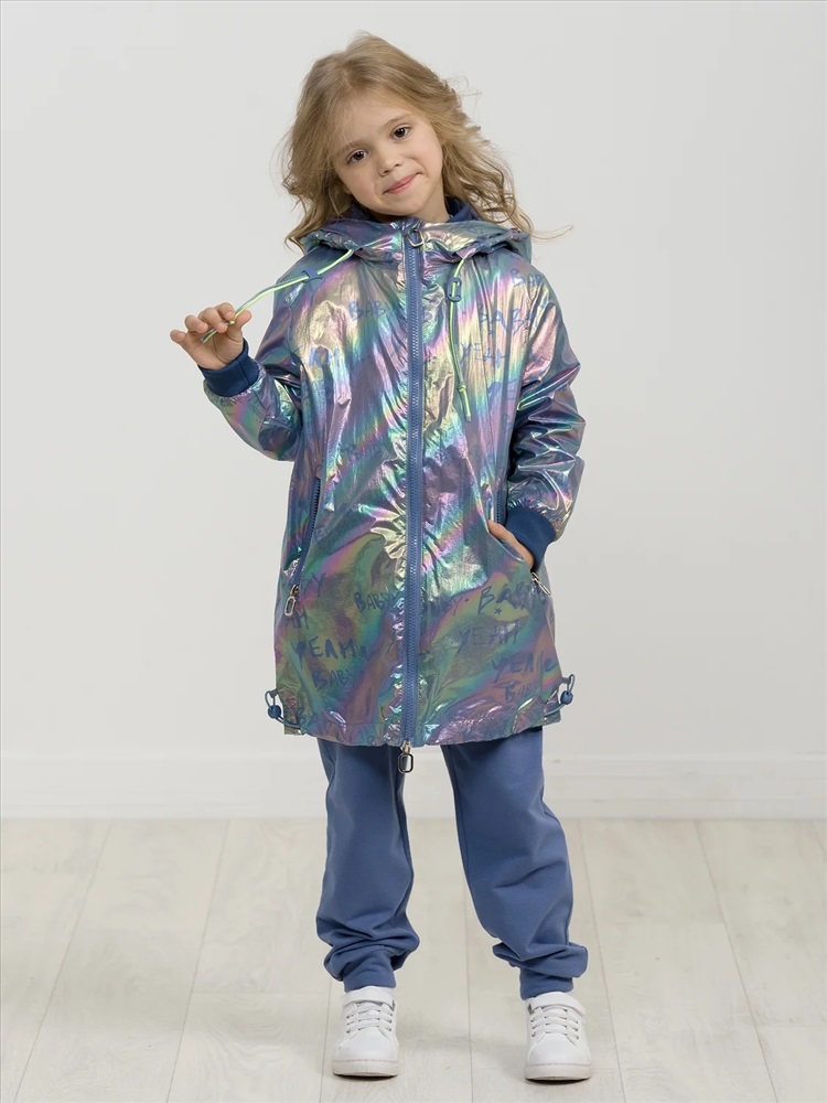 Плащ на тонком подкладе. Рекомендуемый температурный режим не ниже плюс 10 градусов. Ткань с голографическим водоотталкивающим покрытием. Прямой силуэт с регулировкой понизу эластиком со стоппером. Внутренний воротник и манжеты рукавов из рибаны. Оригинальная конструкция капюшона вместо классической утяжки по краю капюшона на шнур с фиксатором спроектирована специальная деталь держатель для декоративной тесьмы, которая регулирует объем капюшона по внешнему краю двойным эластиком с прозрачным наконечником. Световозвращающие элементы в боковых швах.