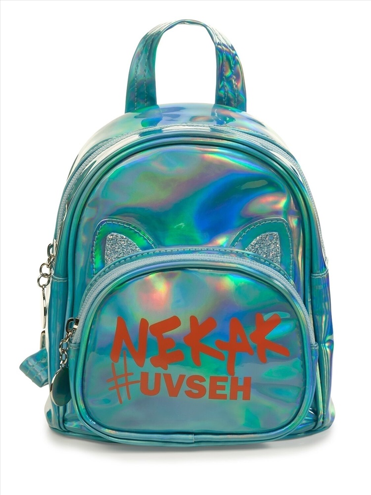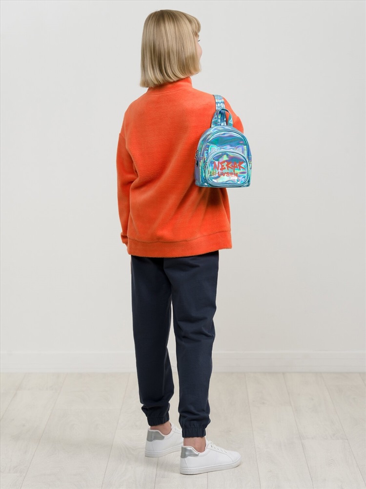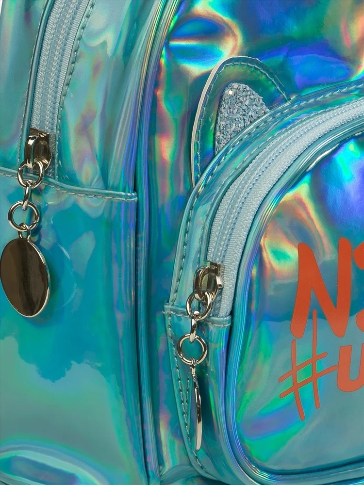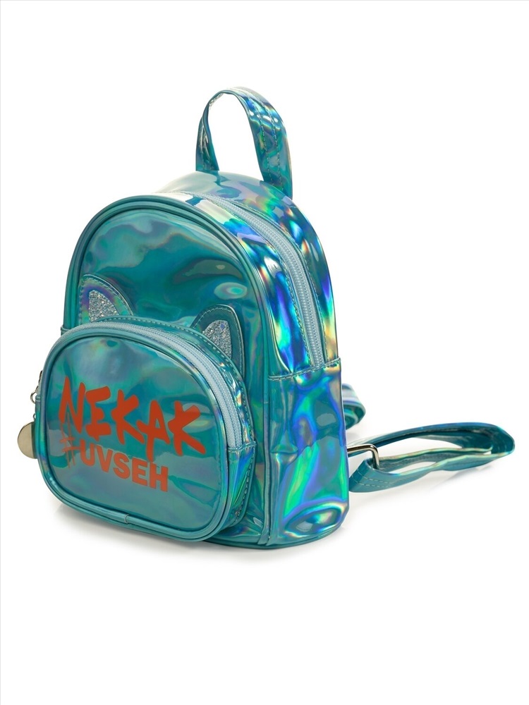 Рюкзак из искусственной лакированной кожи с голографическим отливом. Хорошо держит форму. В рюкзаке 1 отделение и 1 внешний карман. Лямки регулируются по длине. Декор пришивные ушки с голографическим глиттером и яркий принт. Перевод НЕКАК #УВСЕХ.