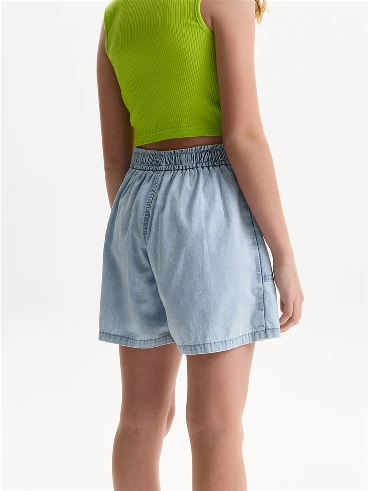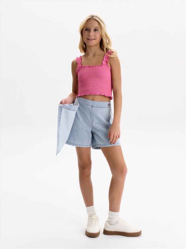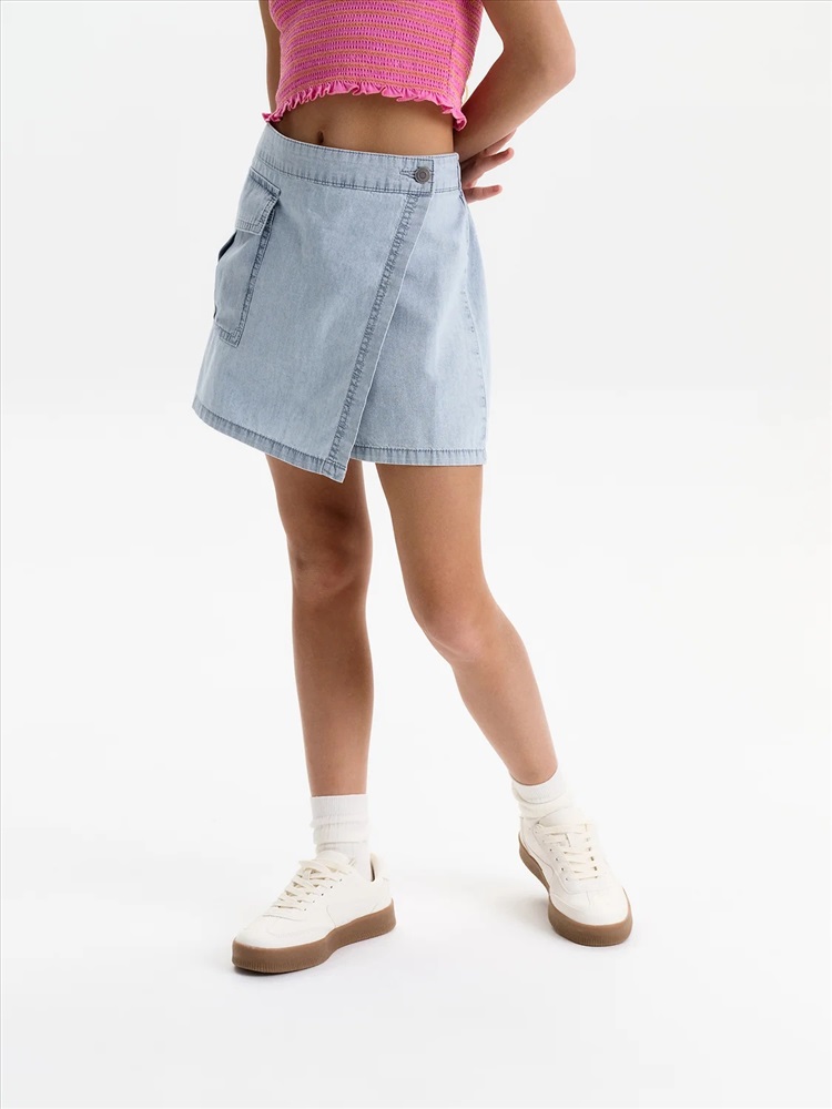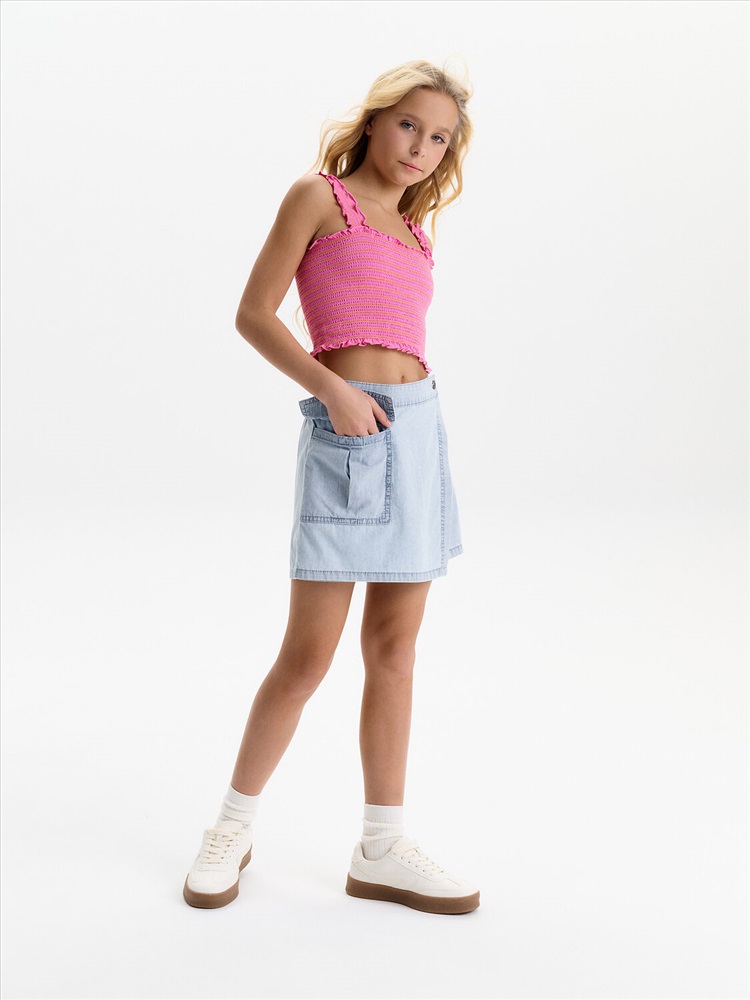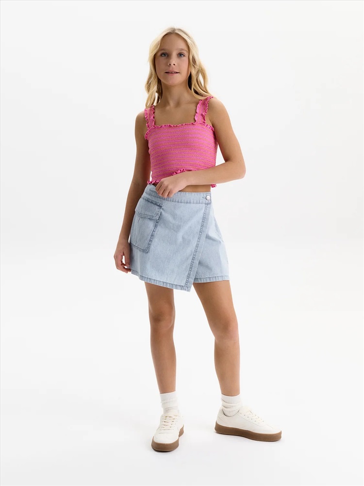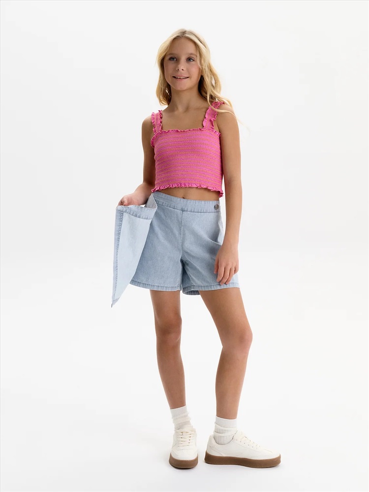 Юбка-шорты из тонкой джинсы Pelican - это стильное и практичное решение для летнего гардероба юной модницы. Модель выполнена из легкой, дышащей джинсовой ткани, которая обеспечит комфорт в жаркую погоду. Шорты с запахом, имитирующим юбку, выглядят очень женственно и оригинально. На передней отлетной части расположен отрезной пояс, фиксирующийся на пуговицу, а на правой половине - накладной карман. По спинке пояс на резинке, что обеспечивает легкость при надевании. Юбка-шорты Pelican - универсальный вариант для повседневной носки, занятий спортом или отдыха в лагере. Тренд 2025 года, эта модель станет любимой вещью в гардеробе любой девочки.