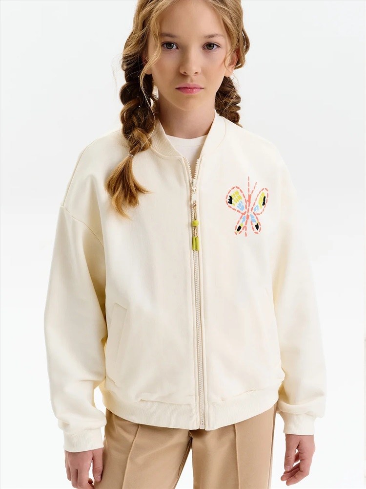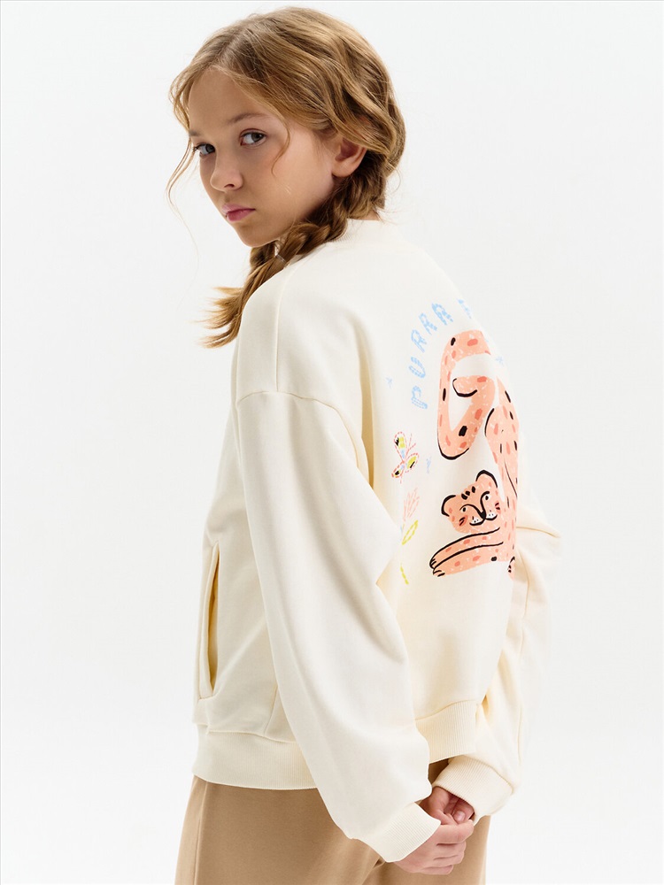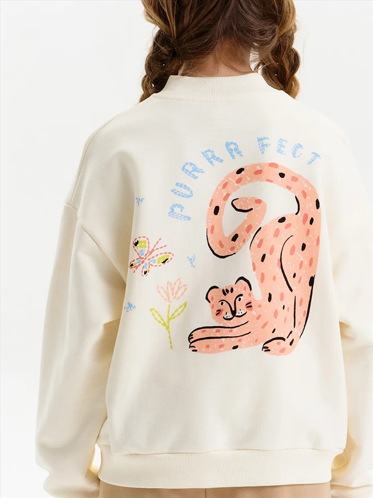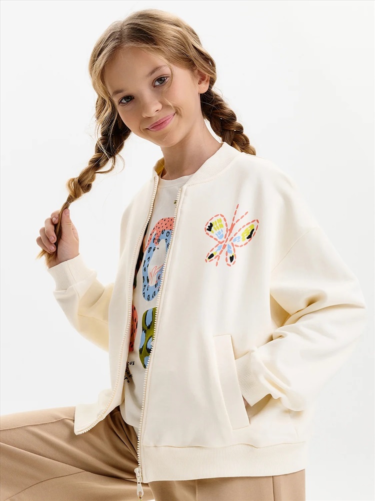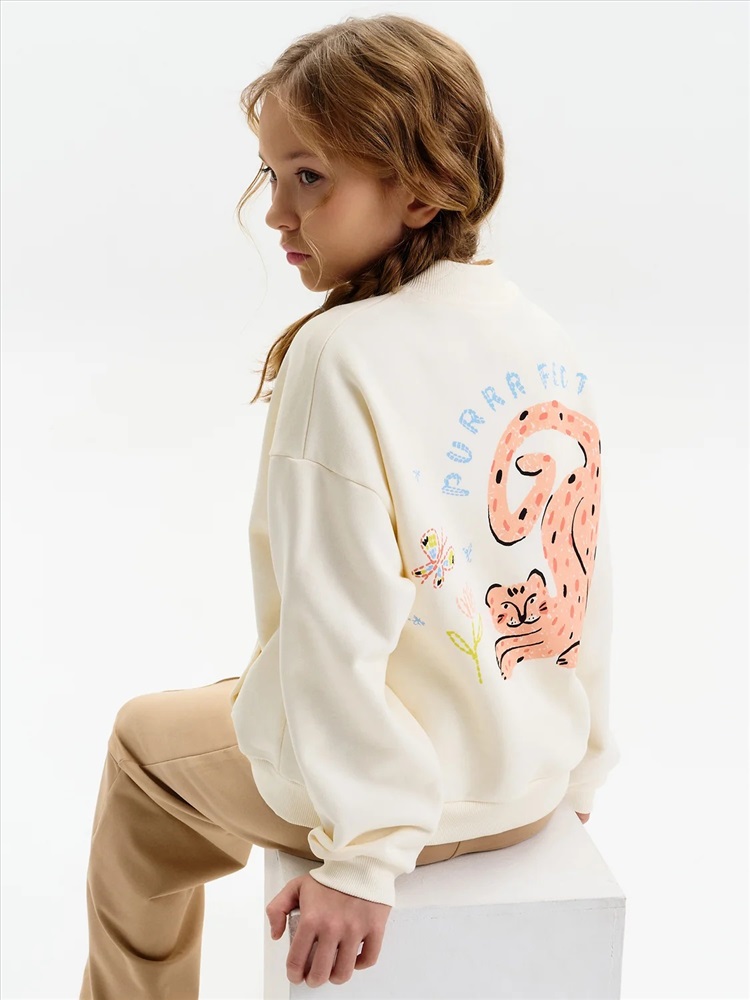 Российский размер: 98 Рост: 98 Возраст: 3 Обхват груди: 52 Обхват талии: 48 Обхват бедер: 57 Артикул поставщика: GFX3390U Состав: 100%хлопок Сезон: Осень, Весна Год: 2026 Толстовка oversize для девочки. Модель средней длины из мягкого хлопкового футера, плотностью 342 гр/кв м. Свободный крой с объёмом по линии груди и низа, мягкое спущенное плечо. Застёжка на центральную молнию. Узкий воротник-стойка и плотные манжеты на рукавах и по низу изделия из эластичной рибаны создают стильную имитацию бомбера. По бокам — удобные прорезные карманы с листочки. Перевод: ПУРРР ФЕКТ(ПЕРФЕКТ) Комментарии к товару
