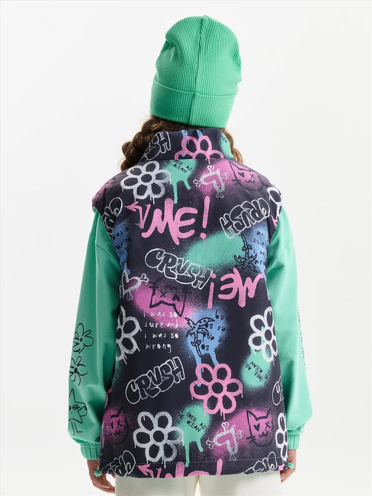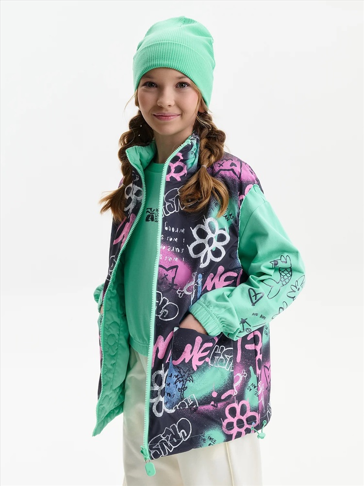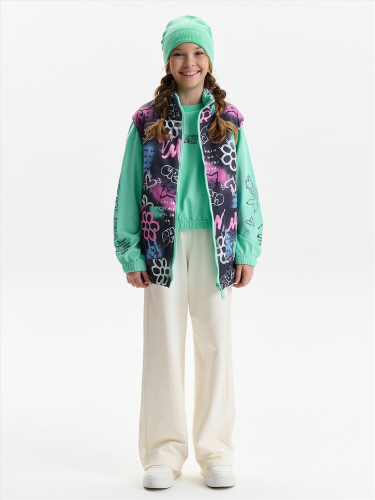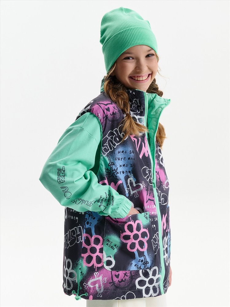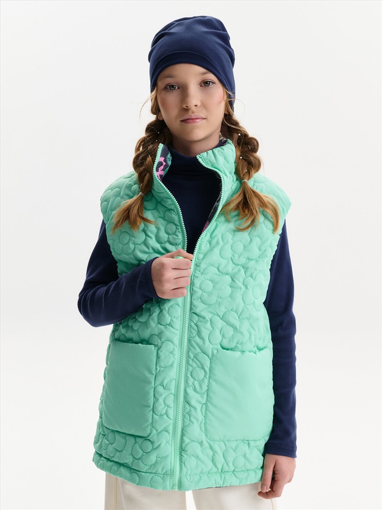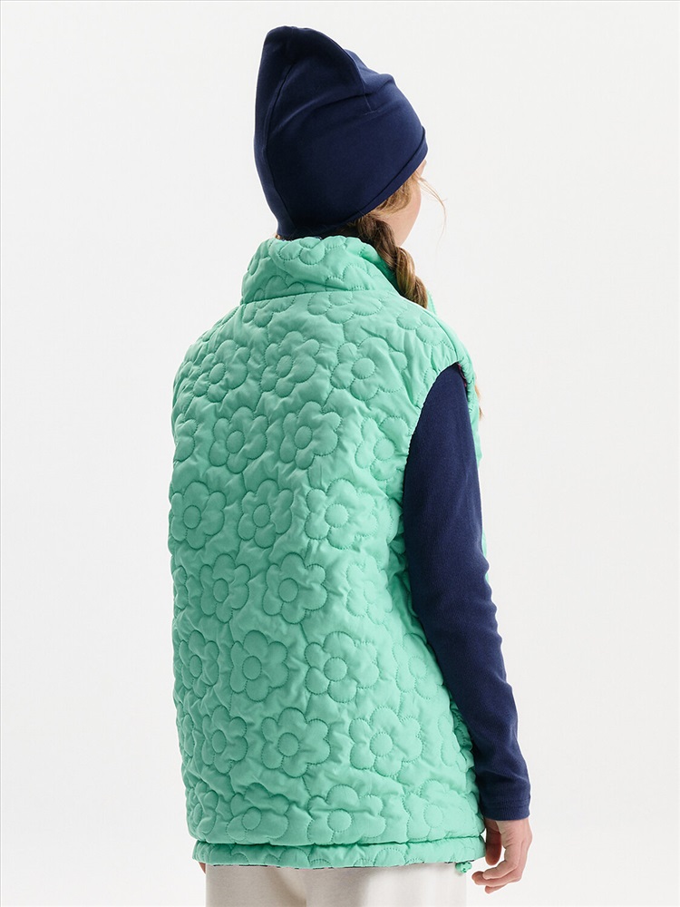 Жилетка для девочки — удобный и функциональный вариант верхней одежды для межсезонья и прохладной погоды. Детская утепленная жилетка выполнена в двустороннем формате, что позволяет менять внешний вид изделия в зависимости от образа и настроения. Жилет детский имеет увеличенный объем и прямой силуэт, благодаря чему комфортно сидит, не сковывает движения и подходит для многослойных комплектов. Модель дополнена накладными карманами, удобными для повседневной носки. Одна сторона жилетки простегана декоративной отстрочкой, вторая выполнена гладкой, без стёжки, что делает модель универсальной и визуально аккуратной. Воротник оформлен в виде высокой стойки, обеспечивающей защиту от ветра. Молния с двусторонним пуллером позволяет легко застегивать жилет с любой стороны, что особенно удобно для двусторонней конструкции. По пройме и по верхнему краю стойки проложен внутренний эластик, который улучшает посадку и комфорт при носке. В качестве утеплителя используется синтепон 60 г/м² в два слоя (120 г/м²) — оптимальный вариант для активных детей, обеспечивающий тепло без утяжеления. По низу жилета предусмотрена утяжка эластичным шнуром со стопперами, позволяющая регулировать посадку и защищать от прохладного воздуха. Утепленная детская жилетка для девочки подходит для прогулок, школы и повседневного использования.