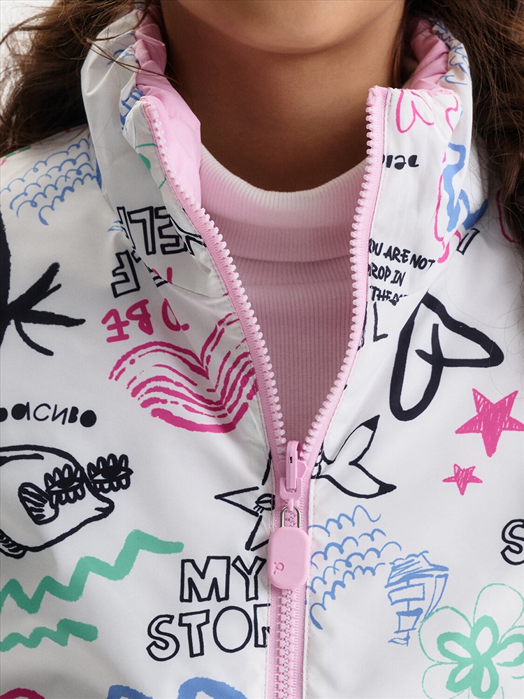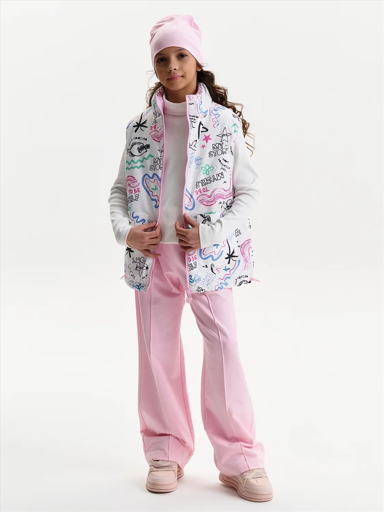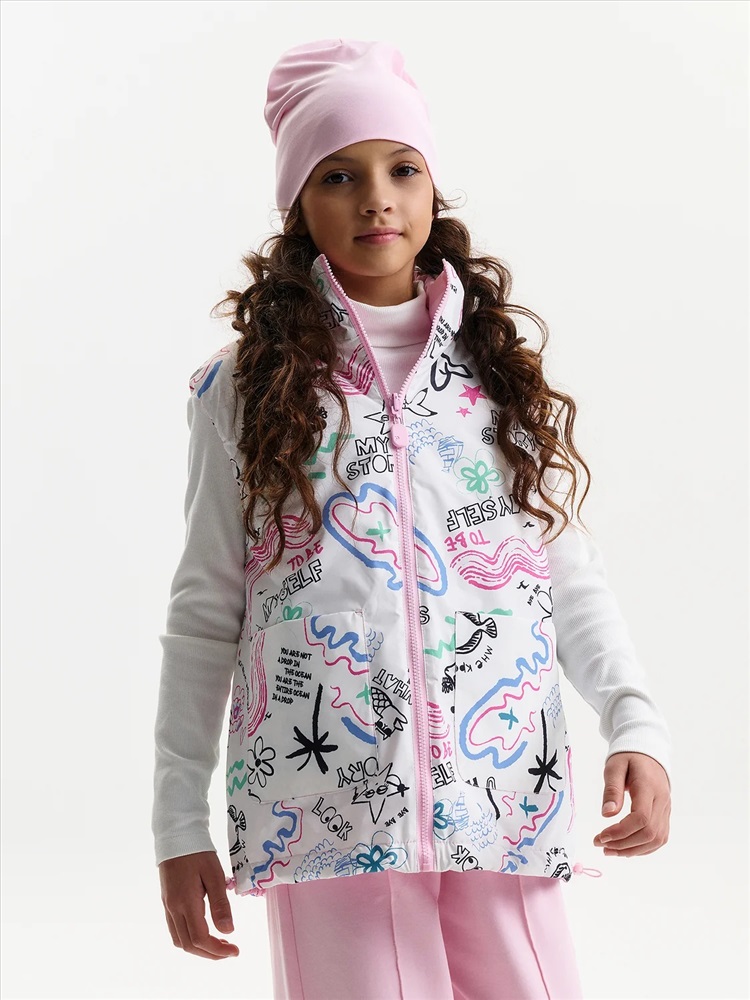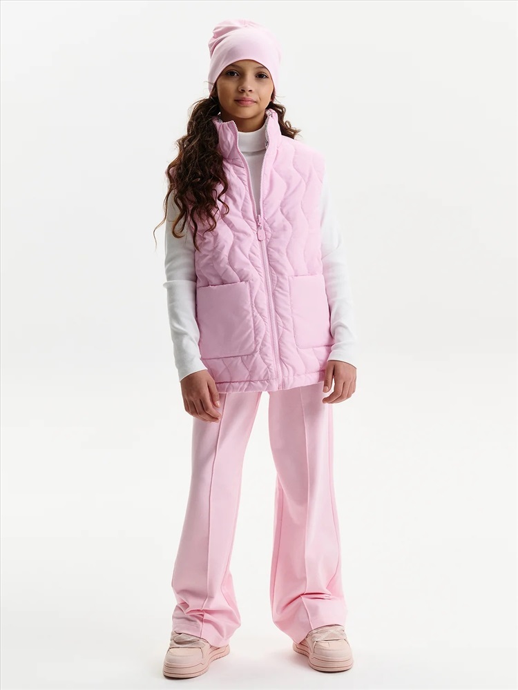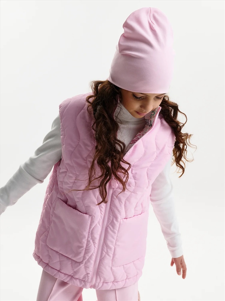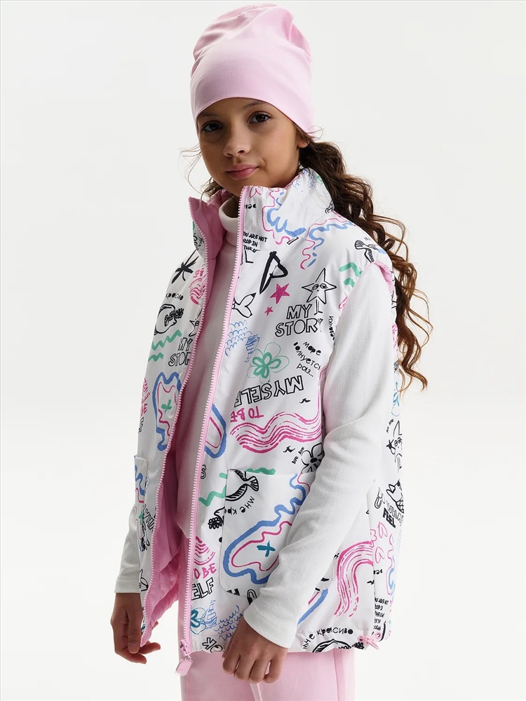 Российский размер: 98 Рост: 98 Возраст: 3 Обхват груди: 52 Обхват талии: 48 Обхват бедер: 57 Артикул поставщика: GZVM3389/1 Состав: 100%полиэстер+мембрана, подклад- 100%полиэстер, утеплитель- 100%полиэстер Сезон: Осень, Весна Год: 2026 Жилетка для девочки — удобный и функциональный вариант верхней одежды для межсезонья и прохладной погоды. Детская утепленная жилетка выполнена в двустороннем формате, что позволяет менять внешний вид изделия в зависимости от образа и настроения. Жилет детский имеет увеличенный объем и прямой силуэт, благодаря чему комфортно сидит, не сковывает движения и подходит для многослойных комплектов. Модель дополнена накладными карманами, удобными для повседневной носки. Одна сторона жилетки простегана декоративной отстрочкой, вторая выполнена гладкой, без стёжки, что делает модель универсальной и визуально аккуратной. Воротник оформлен в виде высокой стойки, обеспечивающей защиту от ветра. Молния с двусторонним пуллером позволяет легко застегивать жилет с любой стороны, что особенно удобно для двусторонней конструкции. По пройме и по верхнему краю стойки проложен внутренний эластик, который улучшает посадку и комфорт при носке. В качестве утеплителя используется синтепон 60 г/м² в два слоя (120 г/м²) — оптимальный вариант для активных детей, обеспечивающий тепло без утяжеления. По низу жилета предусмотрена утяжка эластичным шнуром со стопперами, позволяющая регулировать посадку и защищать от прохладного воздуха. Утепленная детская жилетка для девочки подходит для прогулок, школы и повседневного использования. Комментарии к товару