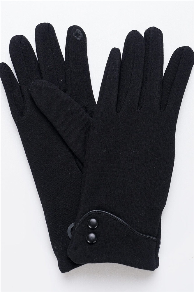 Женские перчатки из трикотажного полотна имитирующего внутри искусственный мех, декорированы кожанной окантовкой и пуговицами, на большом и указательном пальцах вышивка "сенсорными" нитками, размер 18. Продажи по 10 шт