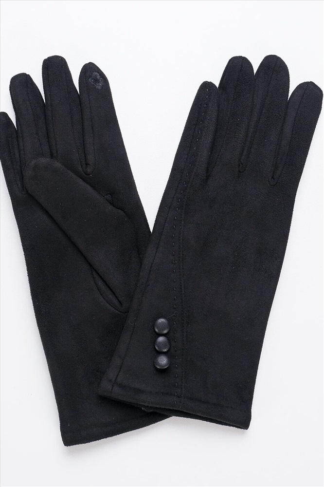 Женские перчатки из искусственной замши, декорированы отстрочкой и кожанными пуговицами, на большом и указательном пальцах вышивка "сенсорными" нитками, размер 18. Продажи по 10 шт