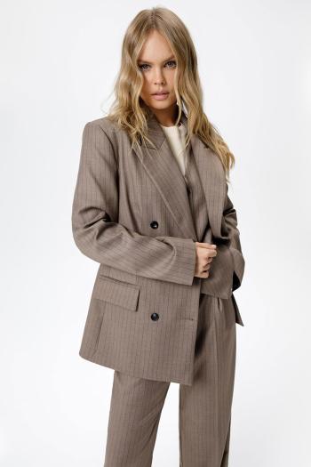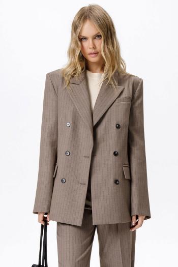 Текстильный костюм-тройка из свободного жакета, полуприлегающего жилета и прямых широких брюк со стрелками. Детали: жакет свободного покроя и полуприлегающего силуэта, двубортная застежка на петли и пуговицы, отрезные бочки, пиджачный воротник, функциональные карманы, жакет на подкладке. Жилет полуприлегающего силуэта, талиевые вытачки, застежка на петли и пуговицы, функциональные карманы, фигурный низ, на подкладке. Брюки с высокой посадкой, притачной пояс со шлевками, передние половины с небольшими застроченными мягкими складками и заутюженными стрелками, застежка на молнию и пуговицу, боковые карманы. Задние части брюк с вытачками и заутюженными стрелками. Пояс брюк прямой, без резинки.