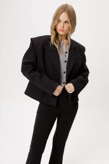 Укороченный оверсайз жакет с необработанными проймами. Детали: жакет прямого силуэта, пиджачный воротник, двубортная застежка на две петли и пуговицы, функциональные карманы, спинка с фигурной кокеткой, рукава втачные, жакет на подкладке.
