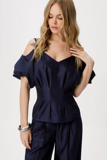 Детали: блуза приталенного силуэта с застроченными складками по линии талии, V-образный вырез переда и спинки, рукава короткие цельнокроеные с вырезом по плечу, застежка на потайную молнию по спинке, на подкладке. Брюки с притачным поясом со шлевками, складки у пояса, застежка на молнию и пуговицу, боковые карманы, заутюженные стрелки. Задние части брюк с вытачками и имитацией карманов.