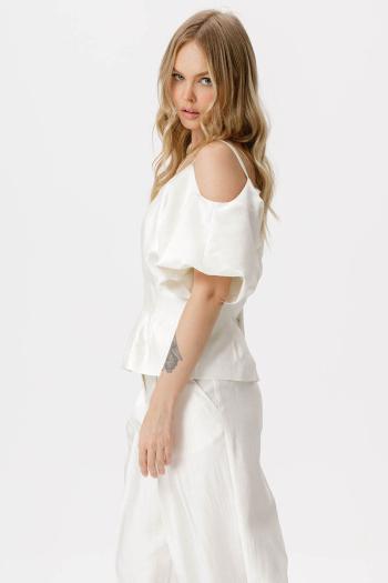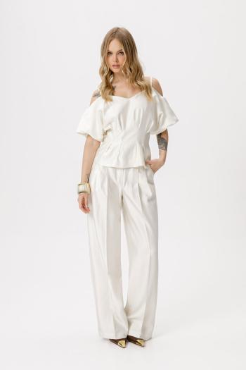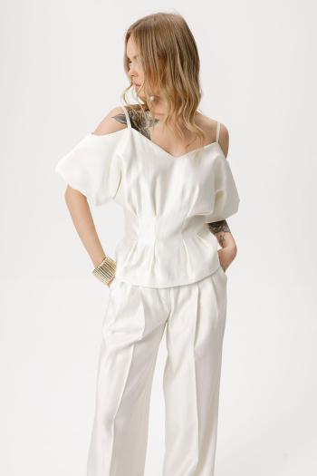 Приталенная блуза со складками. Детали: приталенный силуэт, застроченные складки по линии талии, V-образный вырез переда и спинки, рукава короткие цельнокроеные с вырезом по плечу, застежка на потайную молнию по спинке, на подкладке.