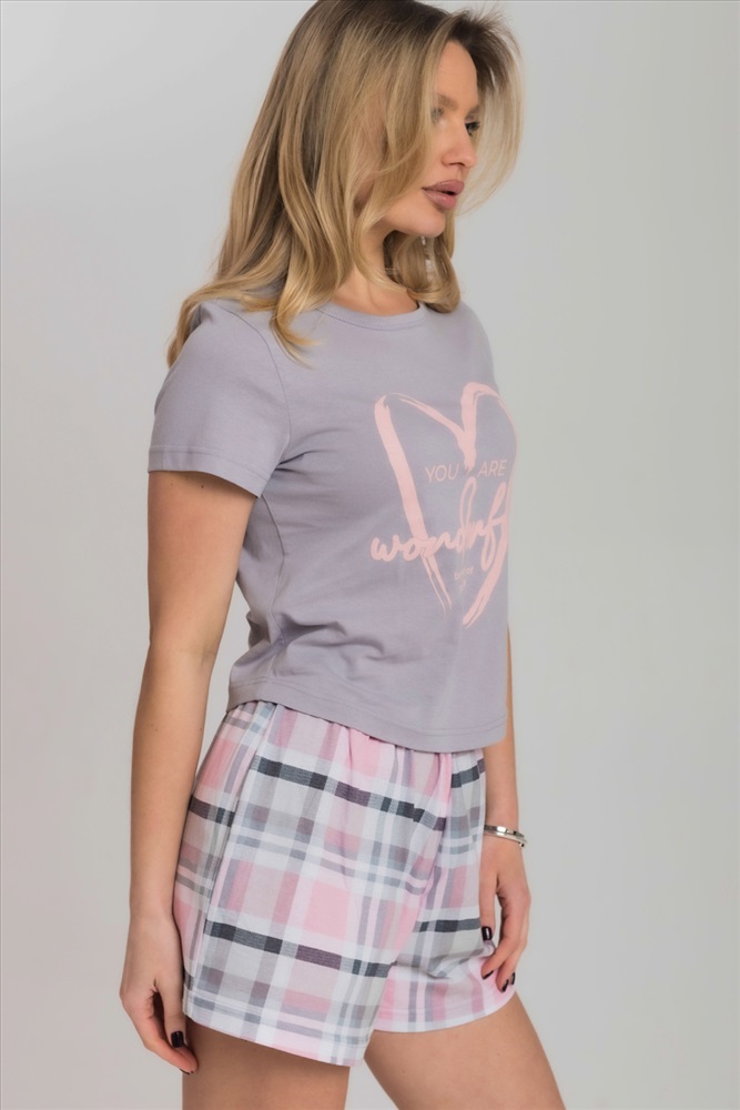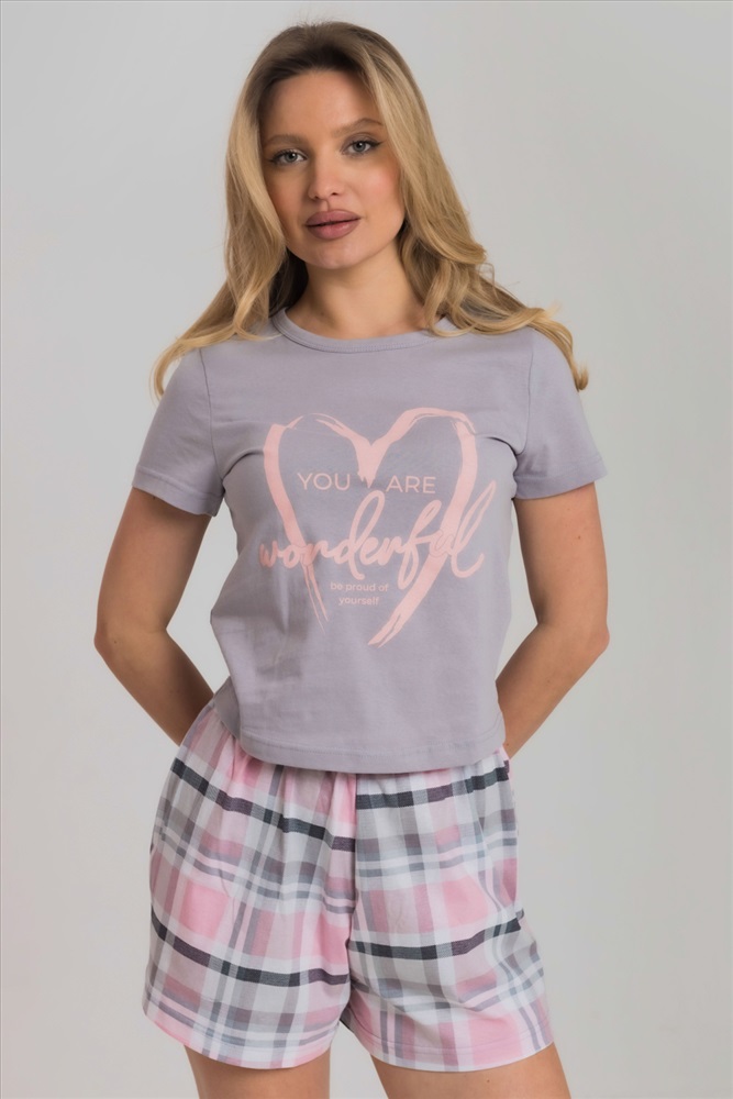 Вид низа комплекта: Шорты Вид ткани: Кулирка Сезон: Всесезонный Состав: Хлопок 100% Цвет Номенклатуры: розовый/светло-серый Женская пижама включает в себя футболку и шорты, выполненные из хлопкового полотна. Футболка прямого кроя с коротким рукавом и круглым вырезом горловины обеспечивает комфорт и свободу движений. Спереди на футболке нанесен принт. Шорты с поясом на широкой резинке, обеспечивают идеальную посадку и удобство. Такой дизайн позволяет свободно двигаться и чувствовать себя комфортно даже во время сна. Комментарии к товару