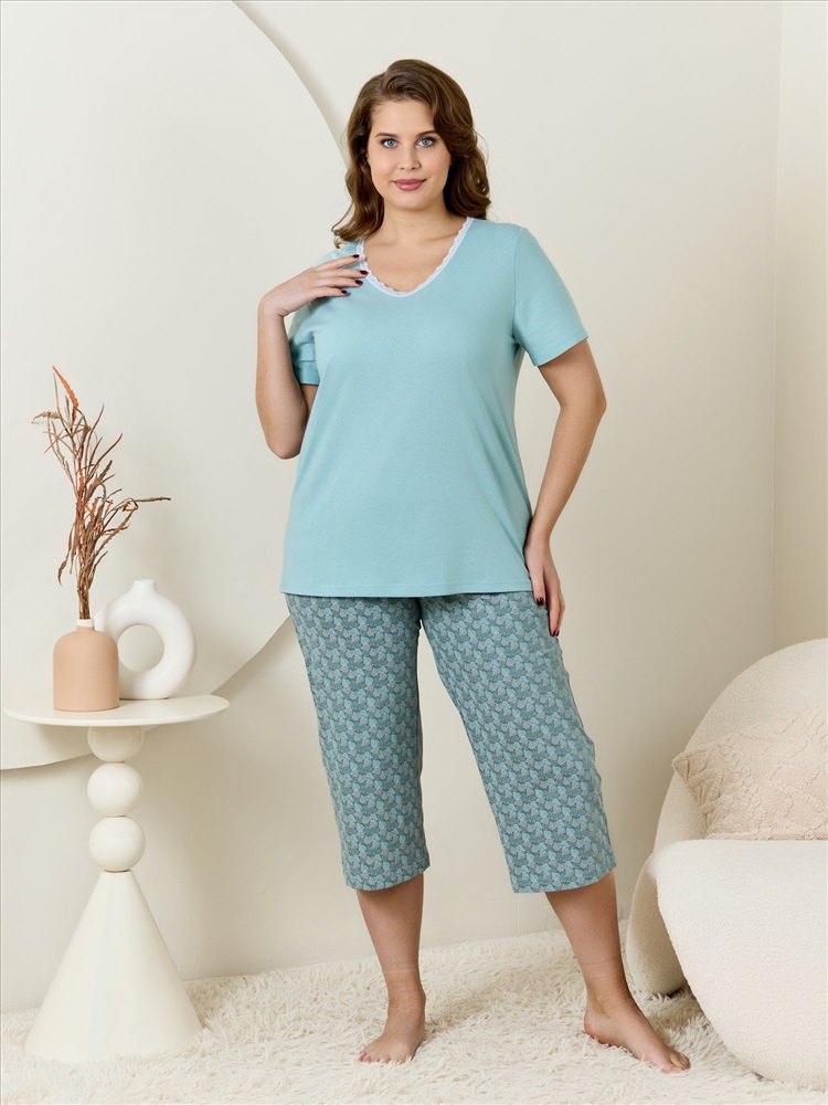 Ткань: Кулирка Кулирка - это самое гладкое и тонкое трикотажное полотно из чистого хлопка. С лицевой стороны ткань «кулирка» выглядит как «вертикальные косички», орнамент изнаночной стороны напоминает «кирпичную кладку». Свойства кулирного трикотажа- воздухопроницаемость, гигроскопичность, не теряя своей формы, практически не тянется в длину и хорошо растягивается в ширину, не образует складки. Пижама женская из трикотажного полотна «кулирка» в комбинации двух видов: гладкокрашеного и с набивным рисунком, состоящая из футболки и бридж. Футболка – из гладкокрашеного полотна, с короткими втачными рукавами и горловиной V-образной формы. Срезы горловины обработаны узким кружевом.Бриджи – из полотна с набивным рисунком, свободные классического покроя, с эластичной тесьмой по талии.