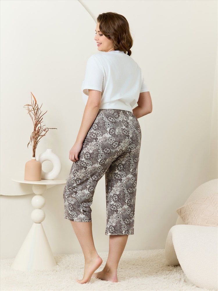 Пижама женская из трикотажного полотна «кулирка» в комбинации двух видов: гладкокрашеного и с набивным рисунком, состоящая из футболки и бридж. Футболка – из гладкокрашеного полотна, с короткими втачными рукавами и горловиной V-образной формы. Срезы горловины обработаны узким кружевом.Бриджи – из полотна с набивным рисунком, свободные классического покроя, с эластичной тесьмой по талии.