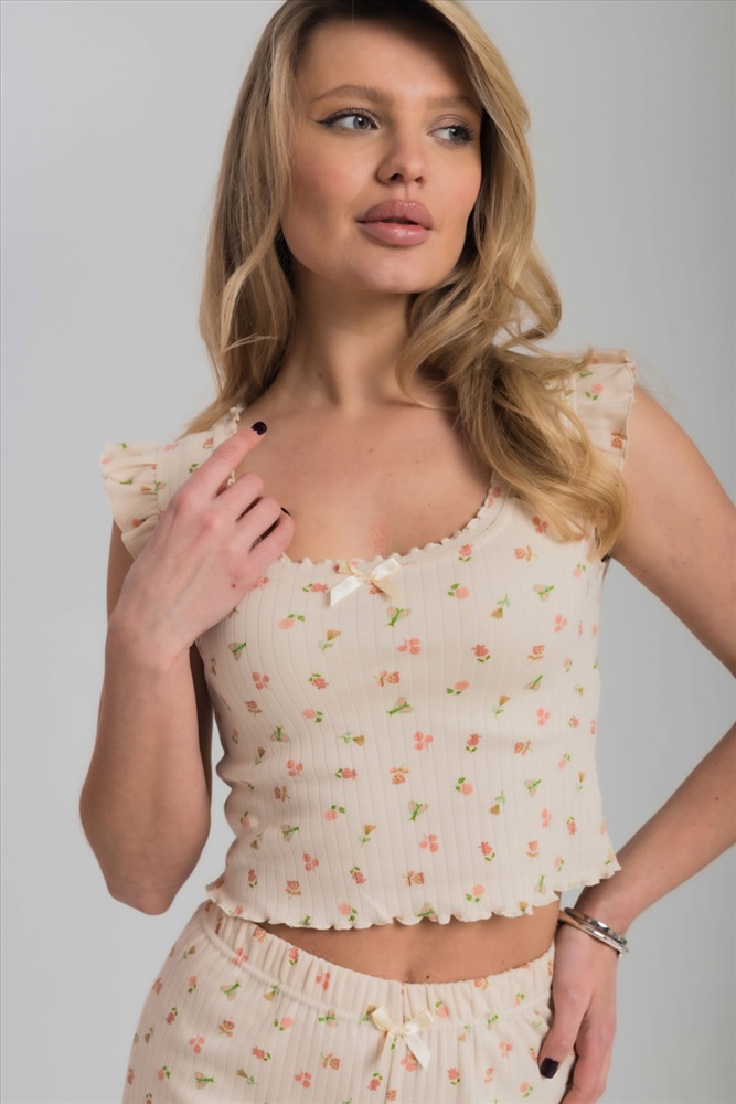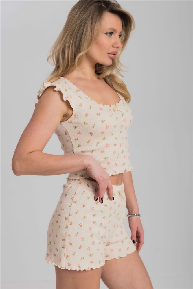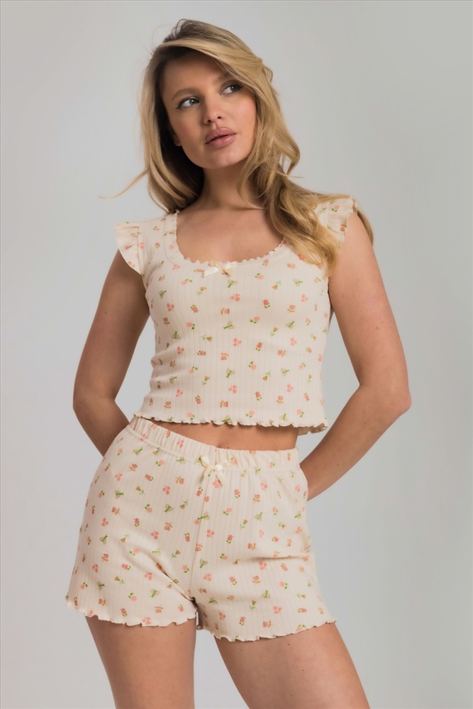 Цвет Номенклатуры: бежевый/персиковый Пижама из мягкого и приятного к телу интерлока состоит из топа и шорт. Топ оформлен милыми "крылышками" по проймам и аккуратной отделкой горловины. Шорты на удобной резинке, без карманов. Пижама декорирована бантиками и отделкой на микрооверлоке, придающей образу нежность и изящность.