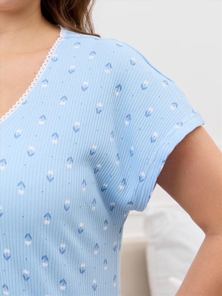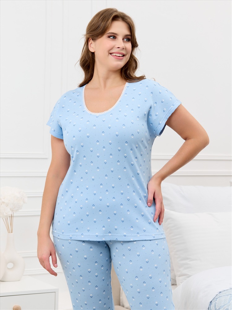Ткань: Кашкорсе Пижама женская из трикотажного полотна «кашкорсе» с набивным рисунком, состоящая из футболки и брюк.Футболка - классического покроя с углубленной формой горловины, обработанной эластичной тесьмой с фасонным краем и цельнокроеными рукавами.Брюки – длинные, свободные, с эластичной тесьмой по талии.